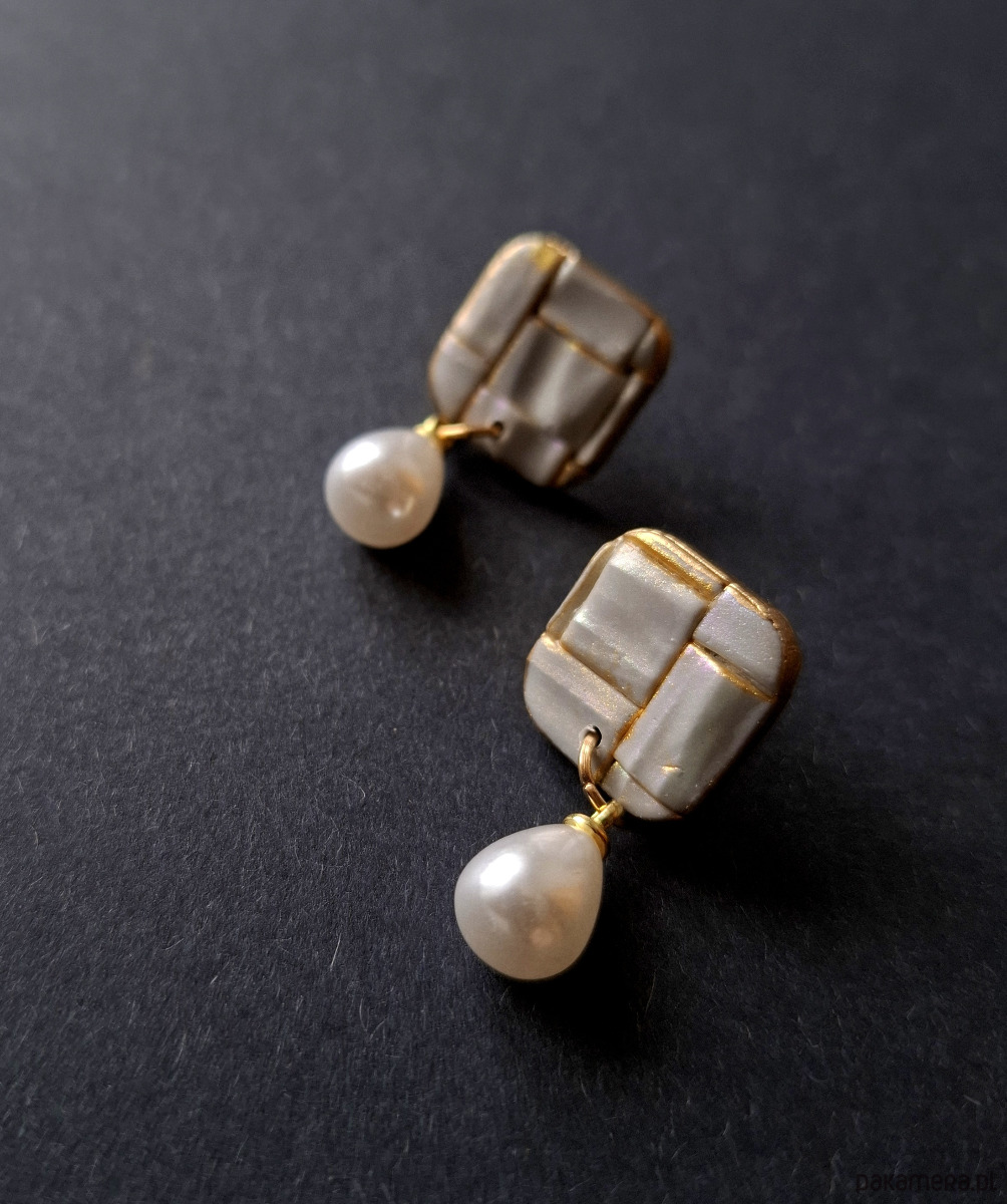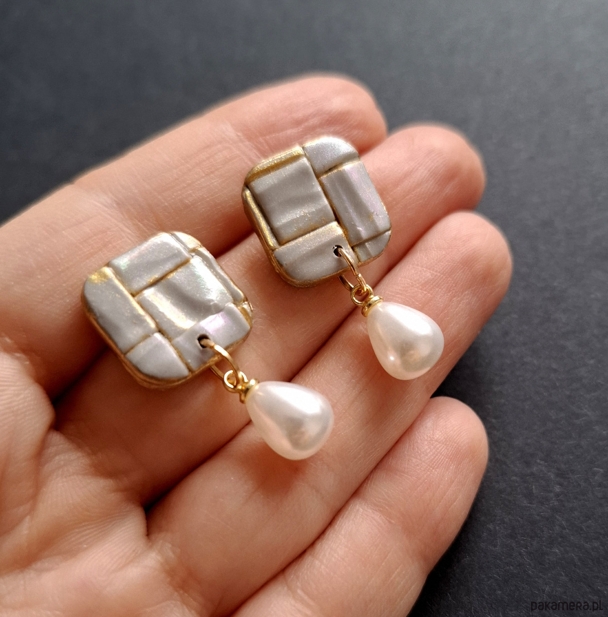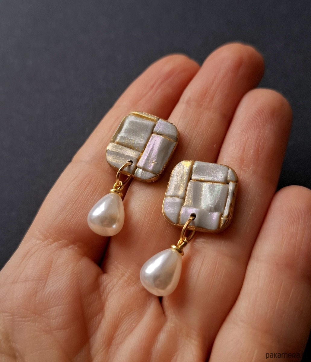 Eleganckie kolczyki na sztyfty z podwieszonymi szklanymi perełkami, wykonane z wysokiej jakości glinki polimerowej w efekcie mieniące się różnymi barwami w zależności od kąta padania światła niczym mozaika z masy perłowej. Jednostronne z pozłacanymi, nieuczulającymi sztyftami. Wymiary: długość wraz z zapięciem: 3 cm; szerokość max. 1,5 cm. Wykonane w jedynym egzemplarzu.