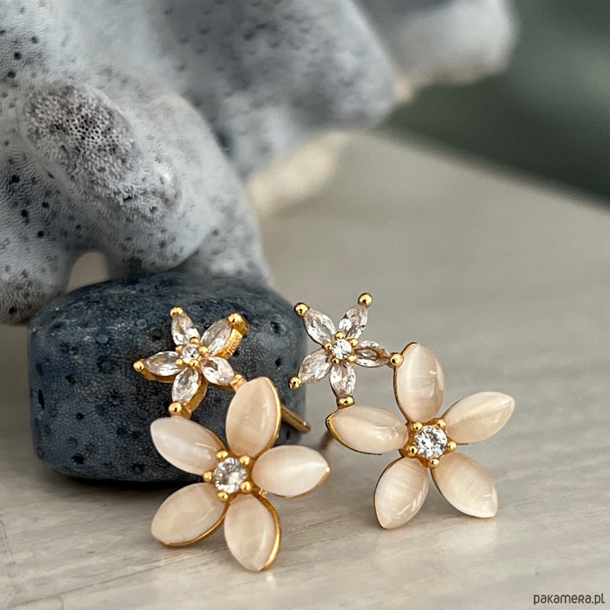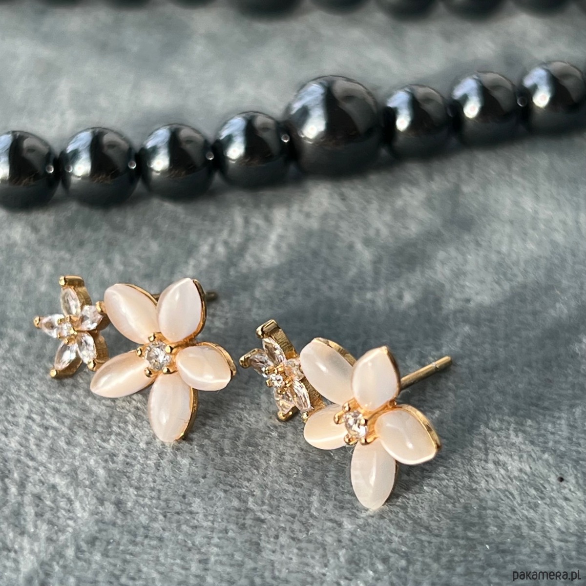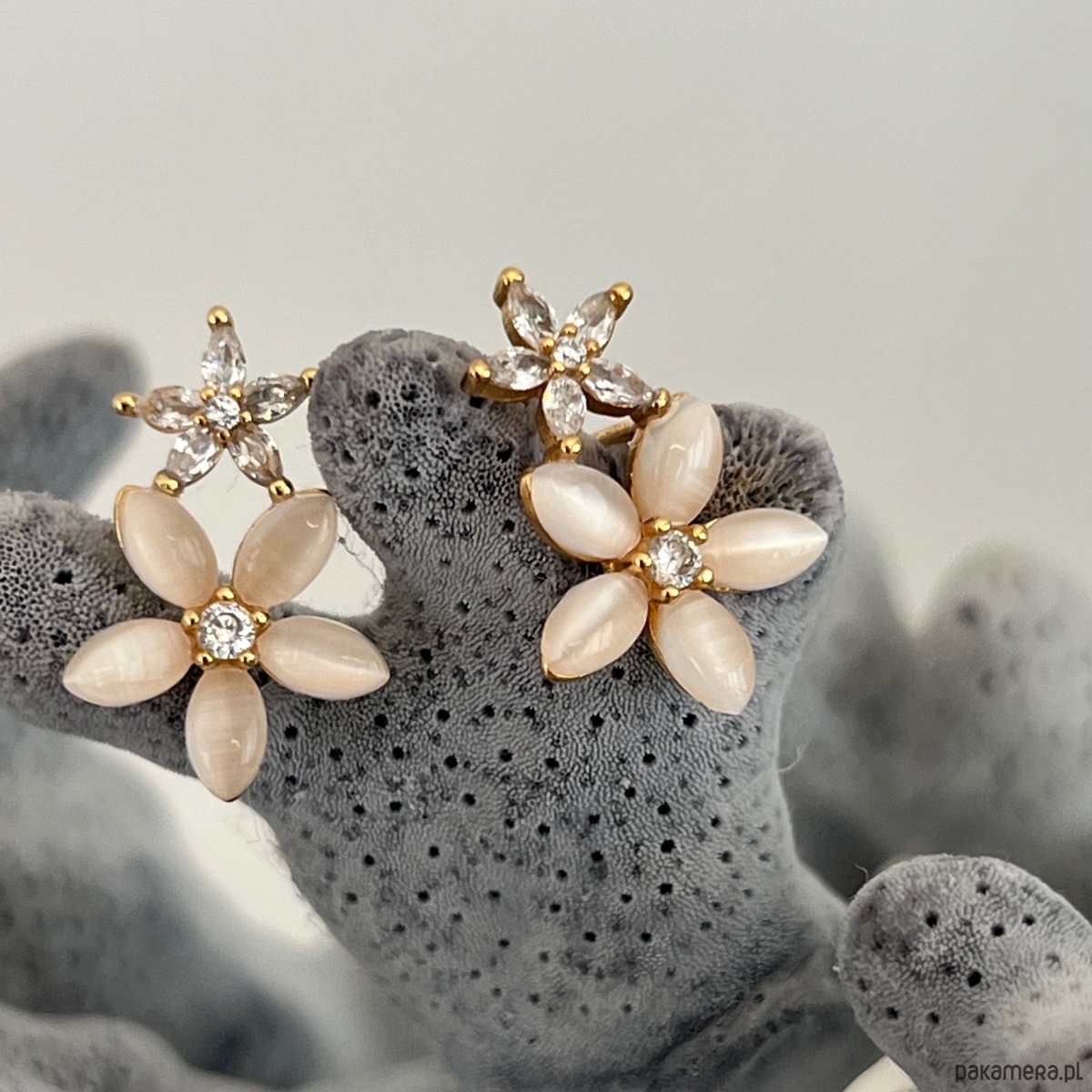 Kolczyki w formie kwiatów z masą perłową i cyrkoniami, srebrne 925, złocone