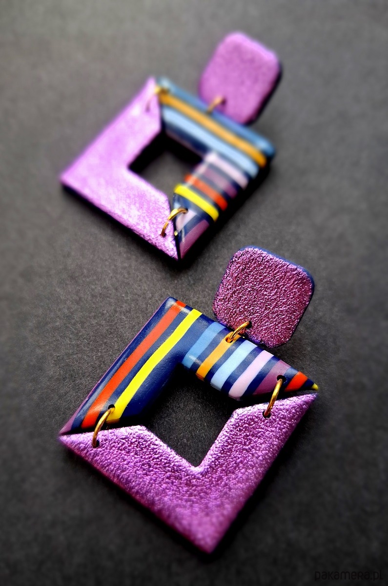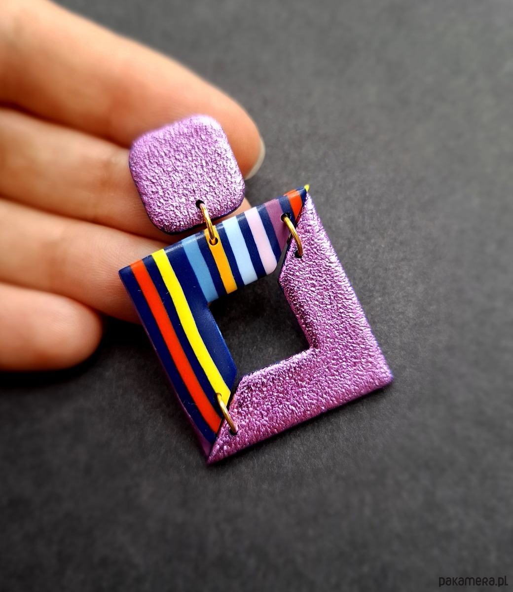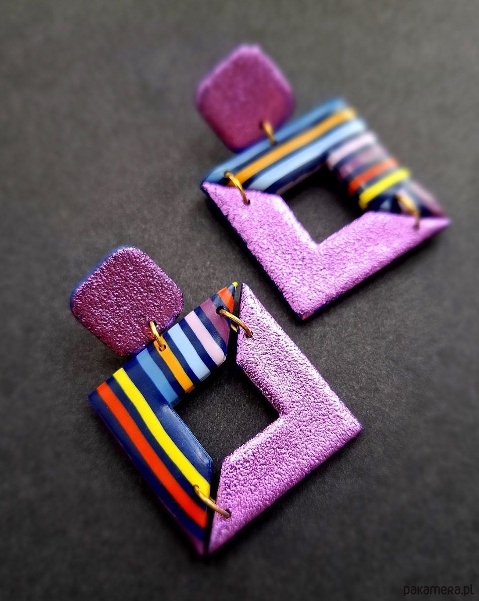 Efektowne, lekkie kolczyki na sztyfty wykonane z wysokiej jakości glinki polimerowej. Jednostronne z pozłacanymi, nieuczulającymi sztyftami. Wymiary: długość wraz z zapięciem: 4,8 cm; szerokość max. 3 cm.