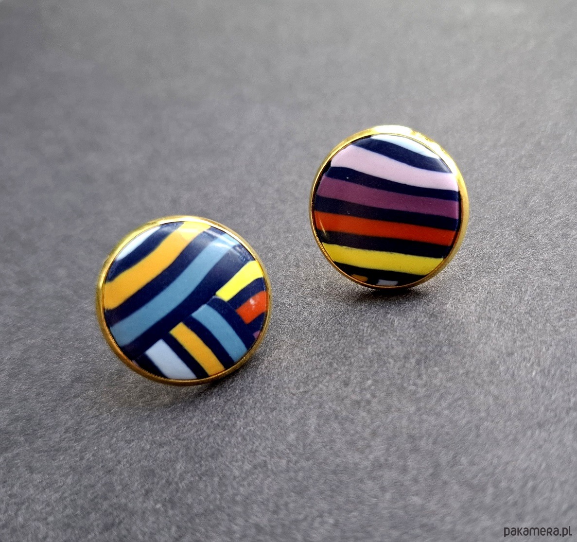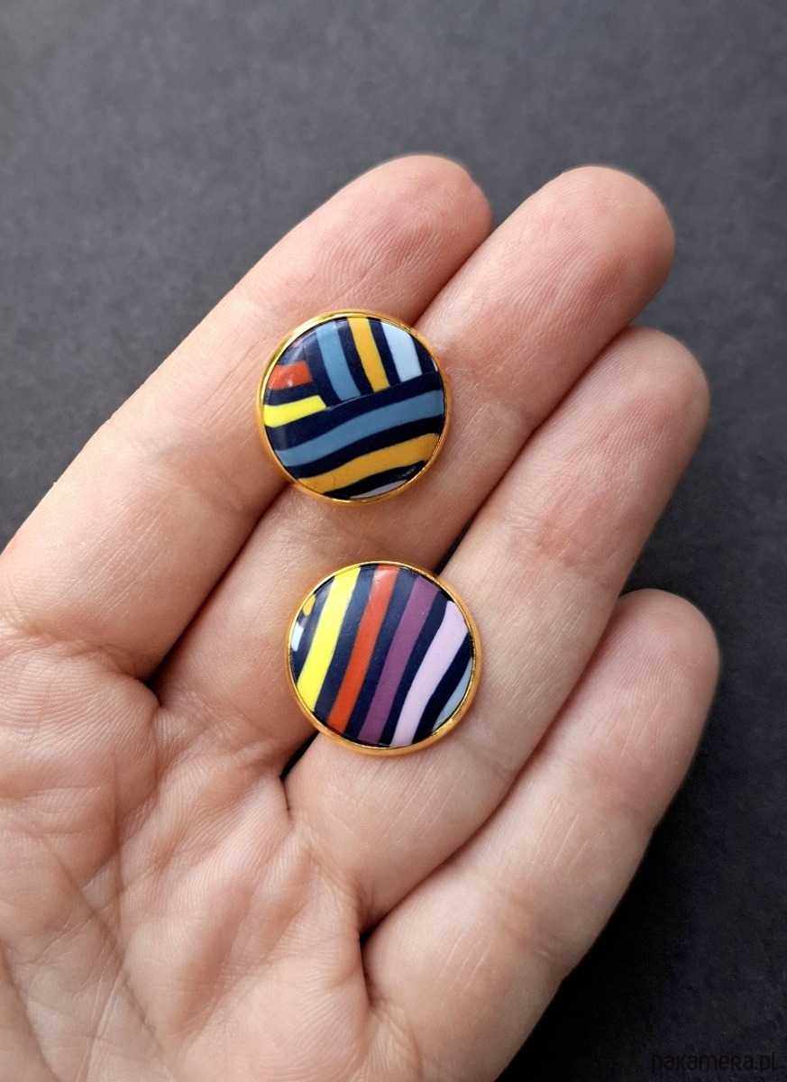 Ozdobne sztyfty wykonane z wysokiej jakości glinki polimerowej. Sztyfty o bazie pozłacanej, nieuczulającej z zapięciem na klasyczne baranki. Średnica kolczyków: 1,7 cm.