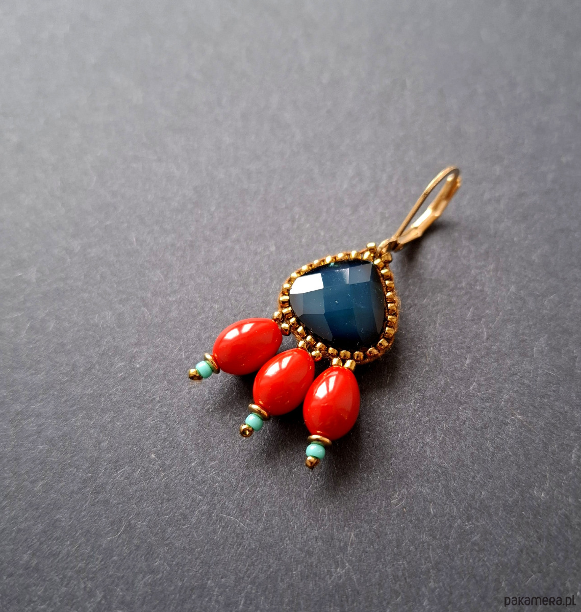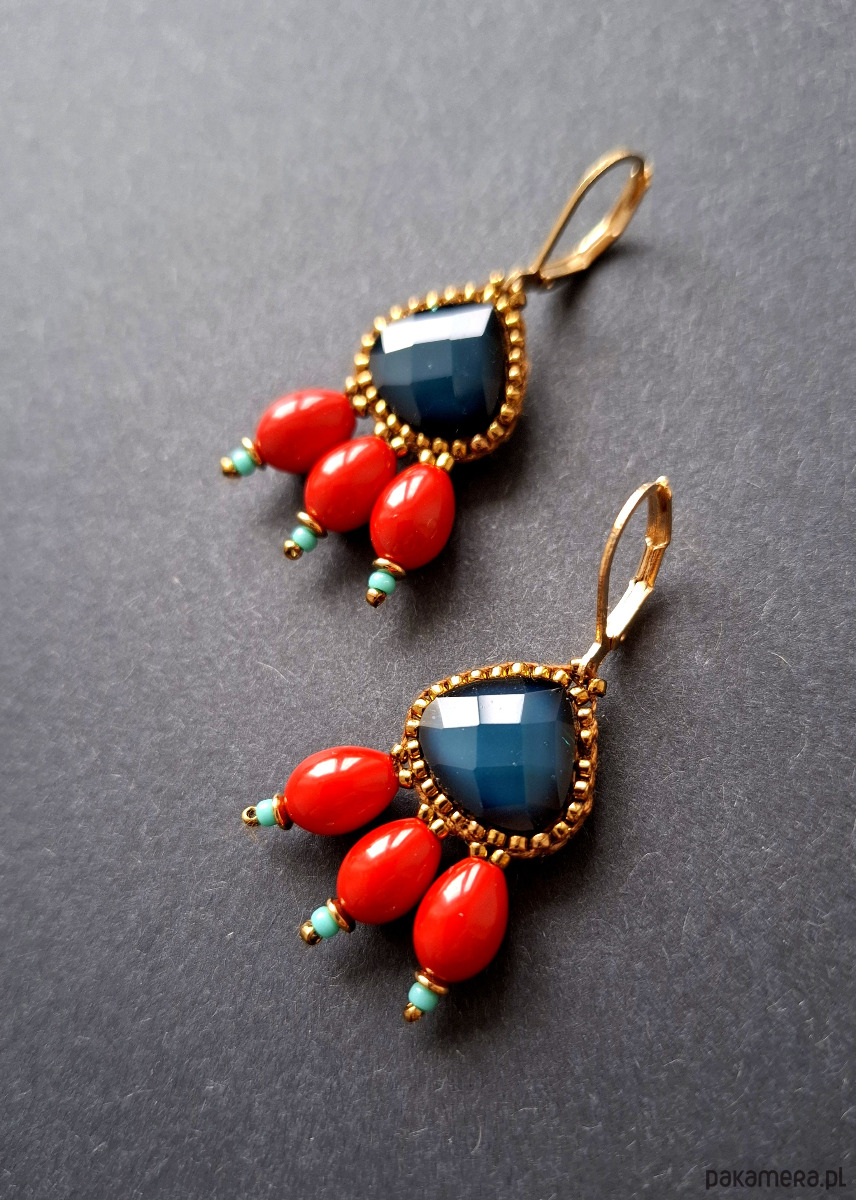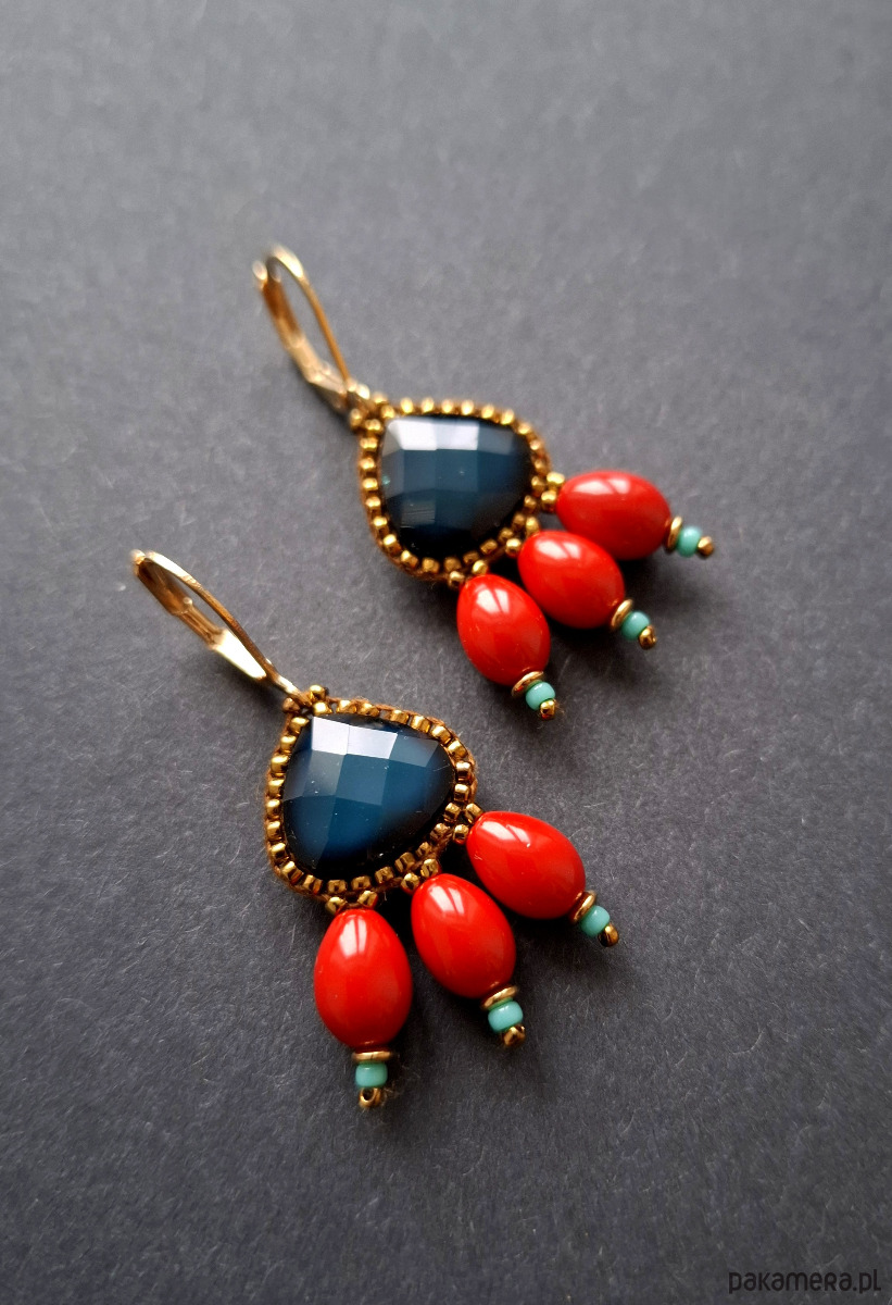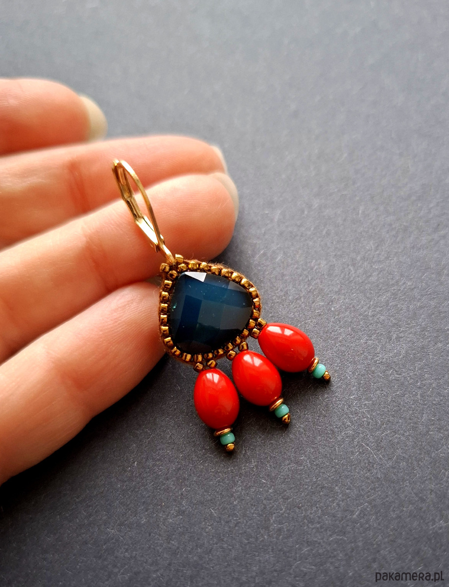 Kolczyki wiszące wykonane techniką swoistego haftu drobnymi, szklanymi koralikami w połączeniu z hematytami platerowanymi. Dwustronne, podwieszone na pozłacanych, nieuczulających biglach typu angielskiego. Wymiary: długość wraz z zapięciem - 4,4 cm, szerokość max. 2 cm.