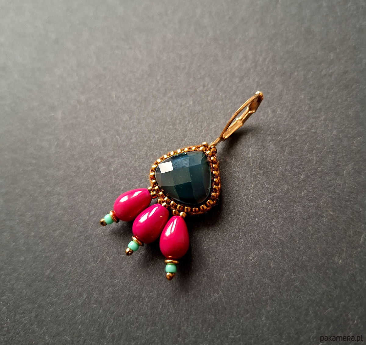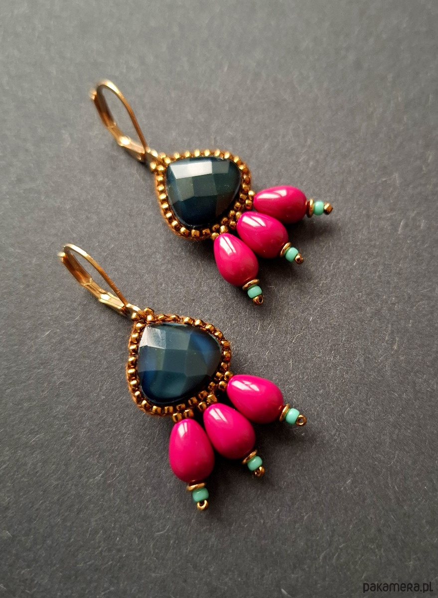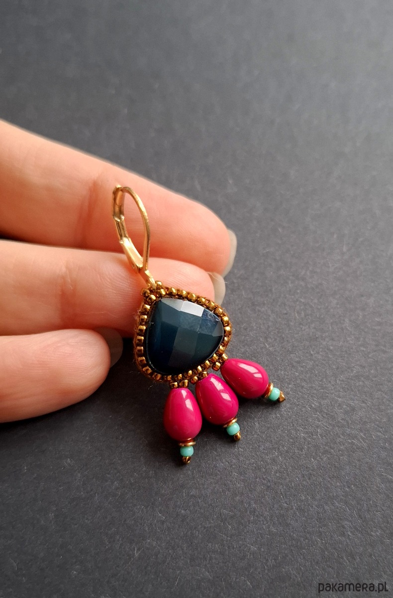 Kolczyki wiszące wykonane techniką swoistego haftu drobnymi, szklanymi koralikami w połączeniu z hematytami platerowanymi. Dwustronne, podwieszone na pozłacanych, nieuczulających biglach typu angielskiego. Wymiary: długość wraz z zapięciem - 4,3 cm, szerokość max. 2 cm.