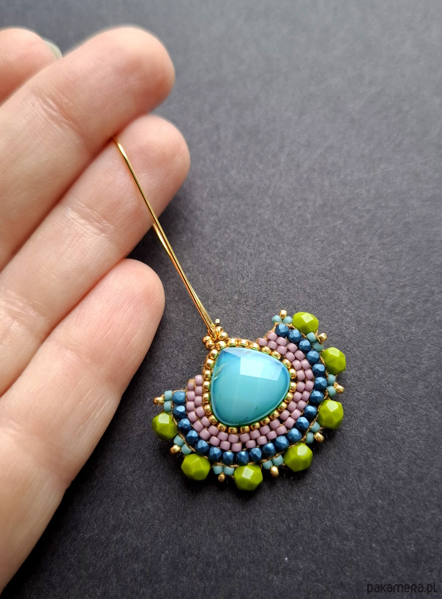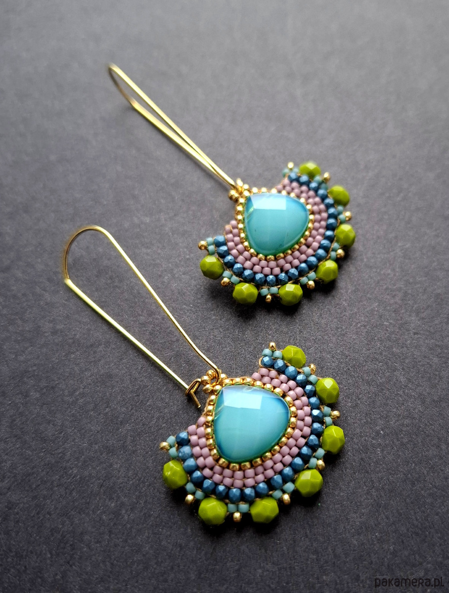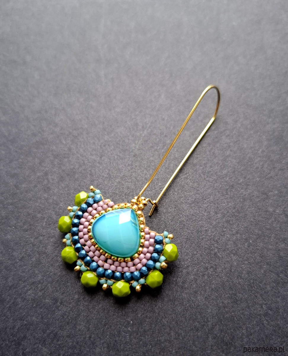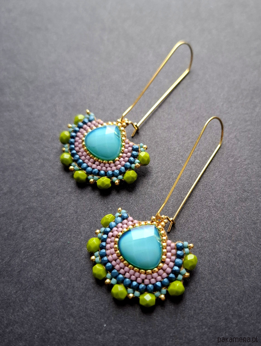 Długie kolczyki wiszące na prostych, pozłacanych biglach; wykonane techniką swoistego haftu drobnymi szklanymi jak i kryształowymi koralikami. Dwustronne podwieszone na pozłacanych i nieuczulających biglach. Wymiary: długość wraz z zapięciem - 6,3 cm, szerokość max. 3 cm. Wykonane w jedynym egzemplarzu.