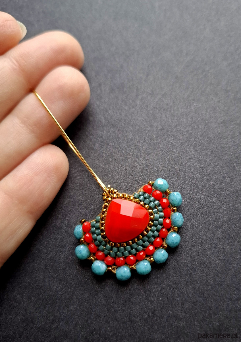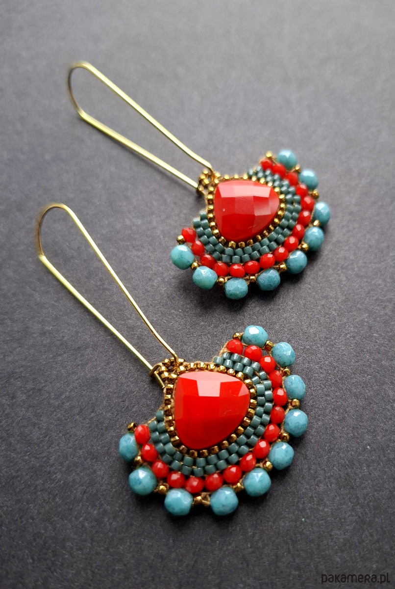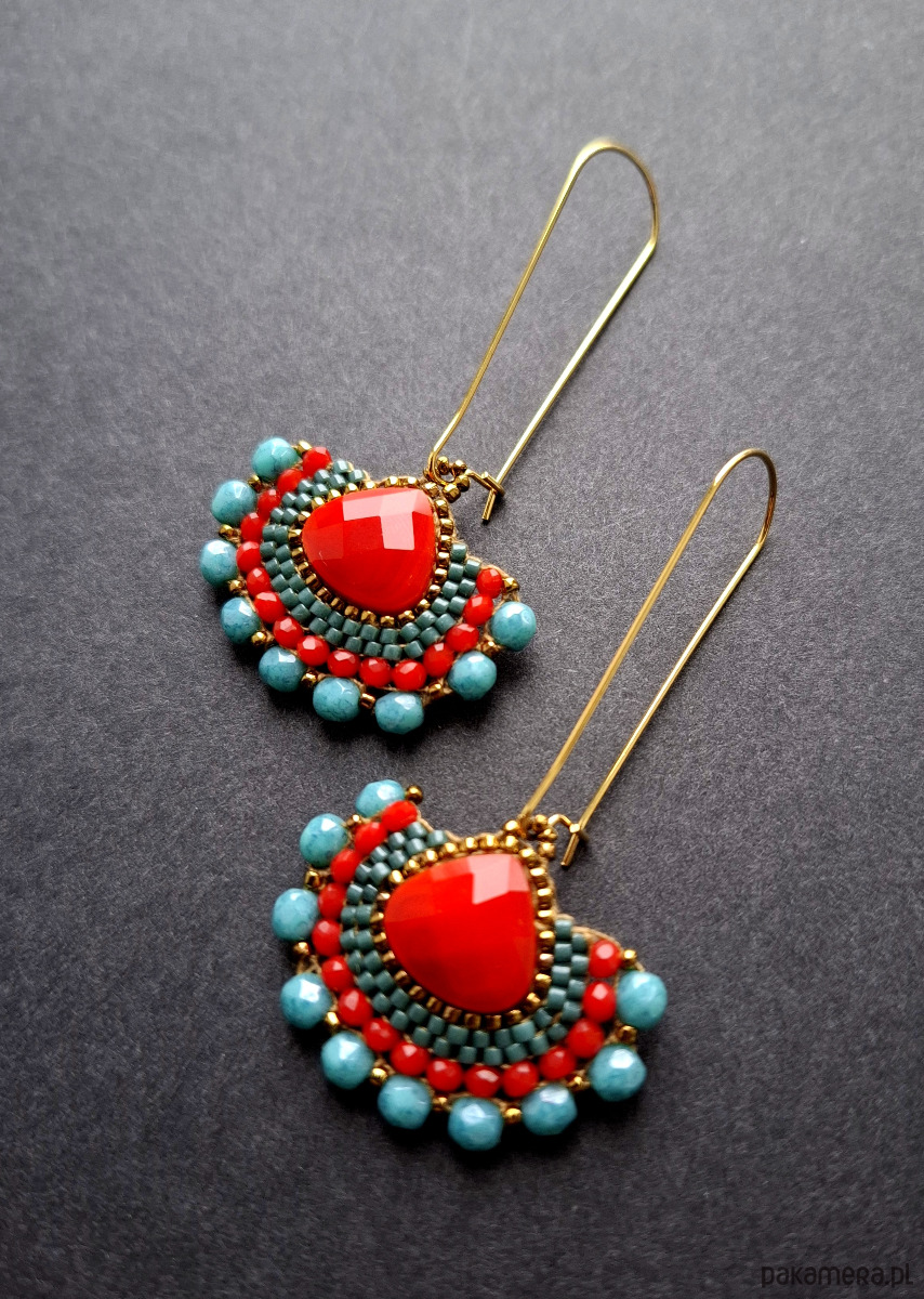 Długie kolczyki wiszące na prostych, pozłacanych biglach; wykonane techniką swoistego haftu drobnymi szklanymi jak i kryształowymi koralikami. Dwustronne podwieszone na pozłacanych i nieuczulających biglach. Wymiary: długość wraz z zapięciem - 6,2 cm, szerokość max. 3,2 cm. Wykonane w jedynym egzemplarzu.