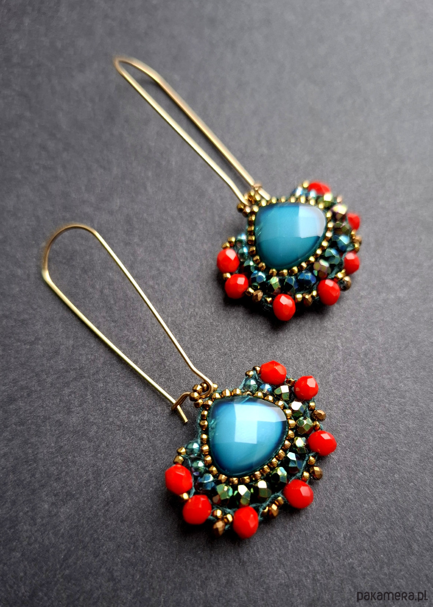 Długie kolczyki wiszące na prostych, pozłacanych biglach; wykonane techniką swoistego haftu drobnymi szklanymi jak i kryształowymi koralikami. Dwustronne podwieszone na pozłacanych i nieuczulających biglach. Wymiary: długość wraz z zapięciem - 6 cm, szerokość max. 3 cm. Wykonane w jedynym egzemplarzu.