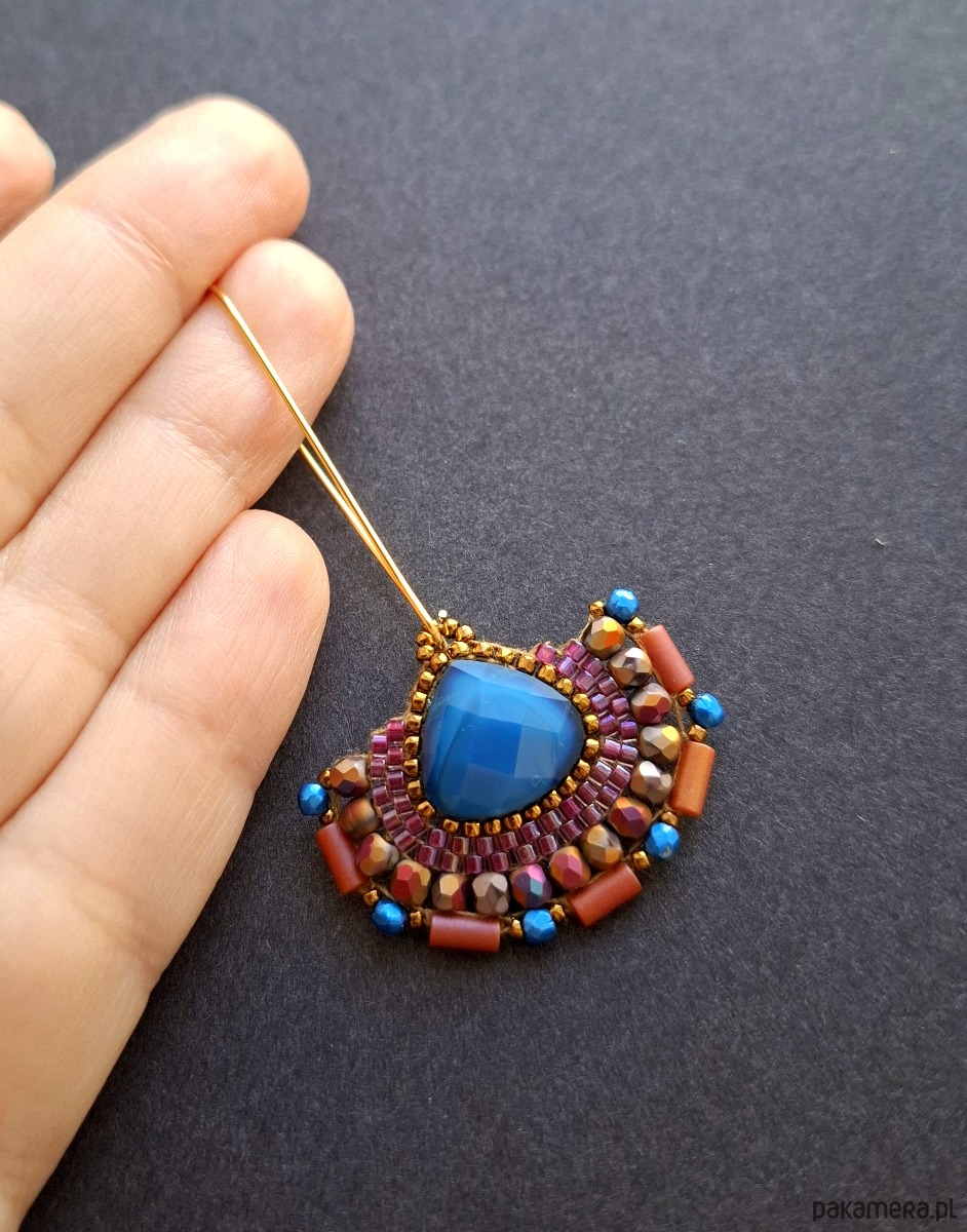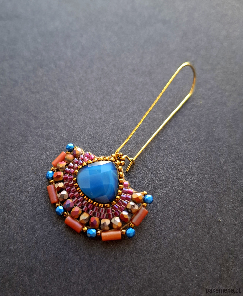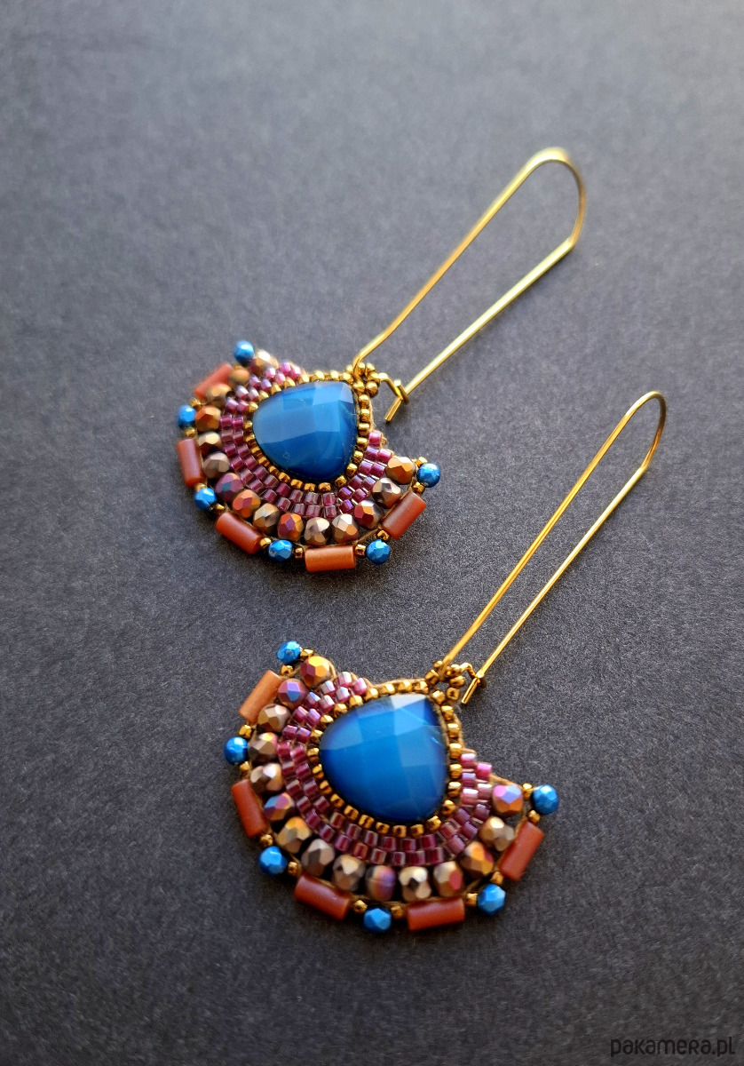 Długie kolczyki wiszące na prostych, pozłacanych biglach; wykonane techniką swoistego haftu drobnymi szklanymi jak i kryształowymi koralikami. Dwustronne podwieszone na pozłacanych i nieuczulających biglach. Wymiary: długość wraz z zapięciem - 6,4 cm, szerokość max. 3,2 cm. Wykonane w jedynym egzemplarzu.