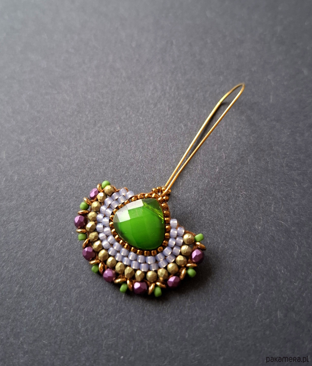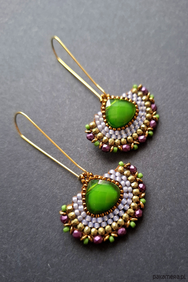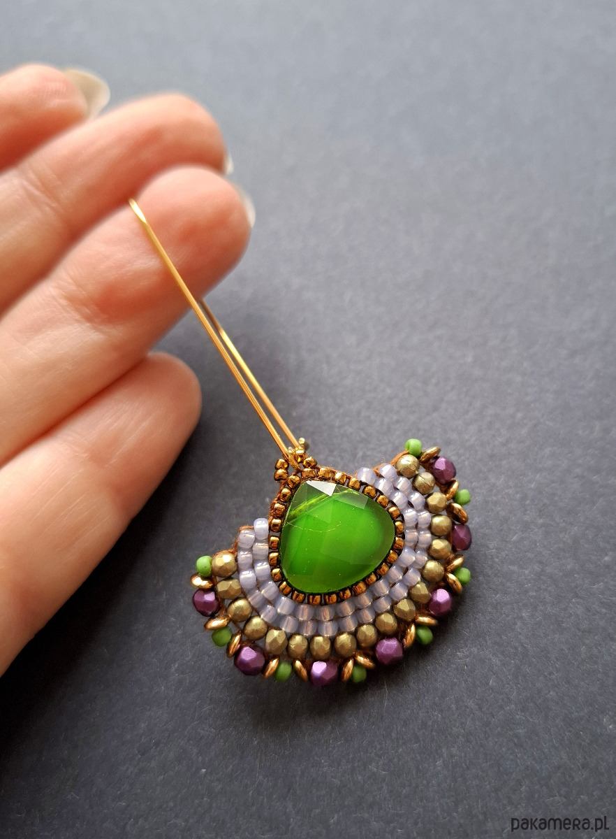 Długie kolczyki wiszące na prostych, pozłacanych biglach; wykonane techniką swoistego haftu drobnymi szklanymi jak i kryształowymi koralikami w połączeniu z hematytami platerowanymi. Dwustronne podwieszone na pozłacanych i nieuczulających biglach. Wymiary: długość wraz z zapięciem - 6,6 cm, szerokość max. 3,8 cm. Wykonane w jedynym egzemplarzu.