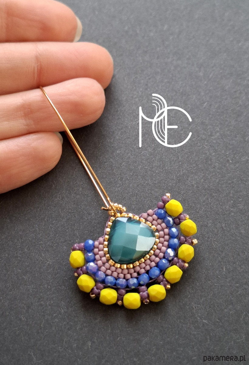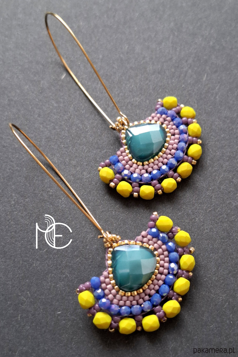 Długie kolczyki wiszące na prostych, pozłacanych biglach; wykonane techniką swoistego haftu drobnymi szklanymi jak i kryształowymi koralikami. Dwustronne podwieszone na pozłacanych i nieuczulających biglach. Wymiary: długość wraz z zapięciem - 7 cm, szerokość max. 3,5 cm. Wykonane w jedynym egzemplarzu.