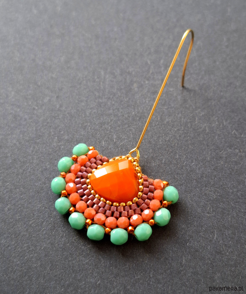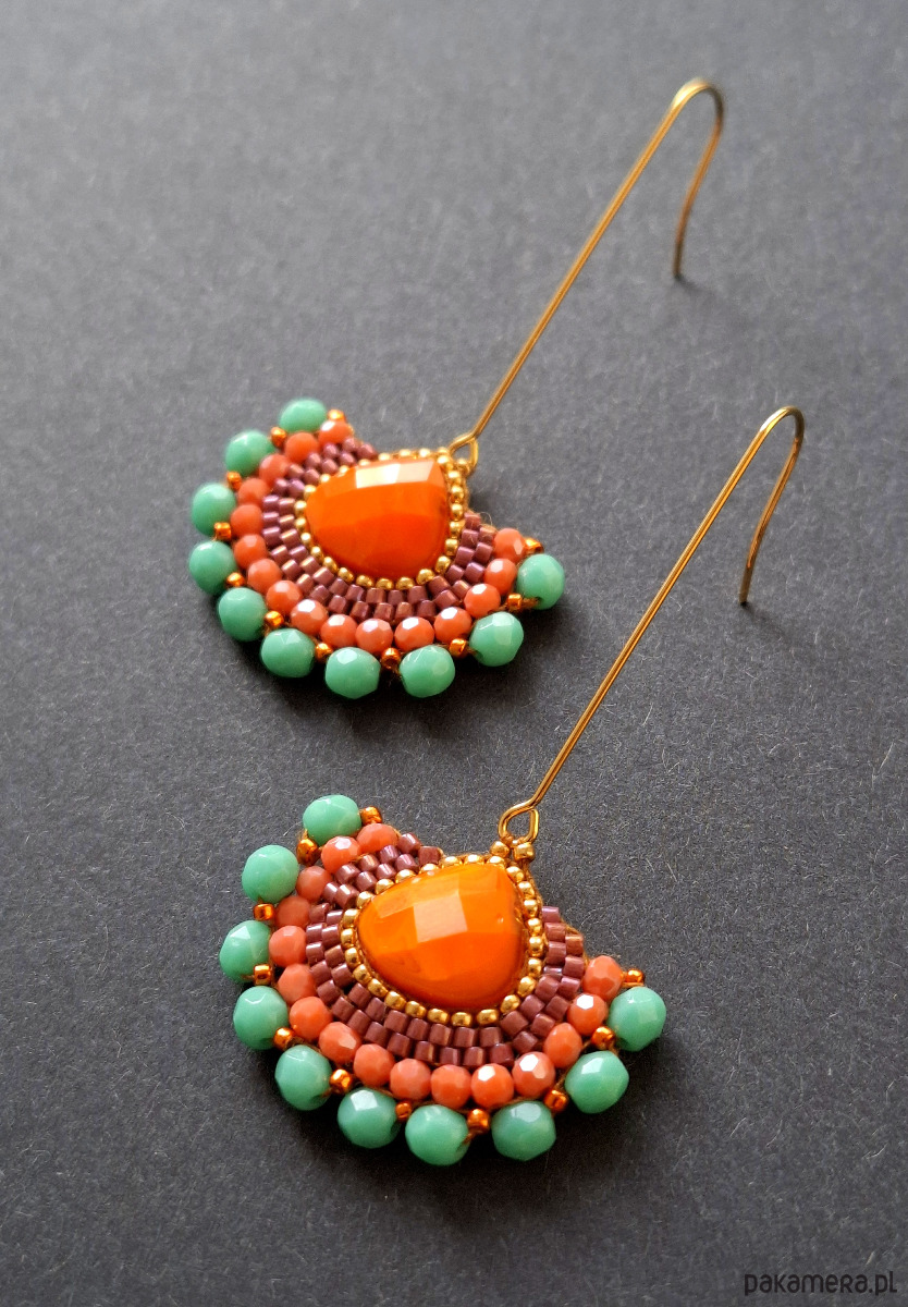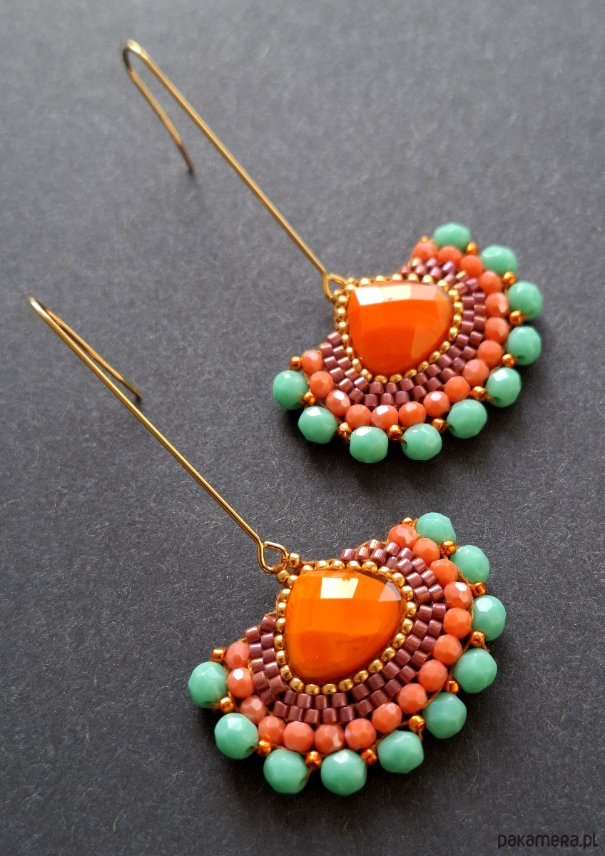 Długie kolczyki wiszące na prostych, pozłacanych biglach; wykonane techniką swoistego haftu drobnymi szklanymi jak i kryształowymi koralikami. Dwustronne podwieszone na pozłacanych i nieuczulających biglach. Wymiary: długość wraz z zapięciem - 6,3 cm, szerokość max. 3,4 cm. Wykonane w jedynym egzemplarzu.