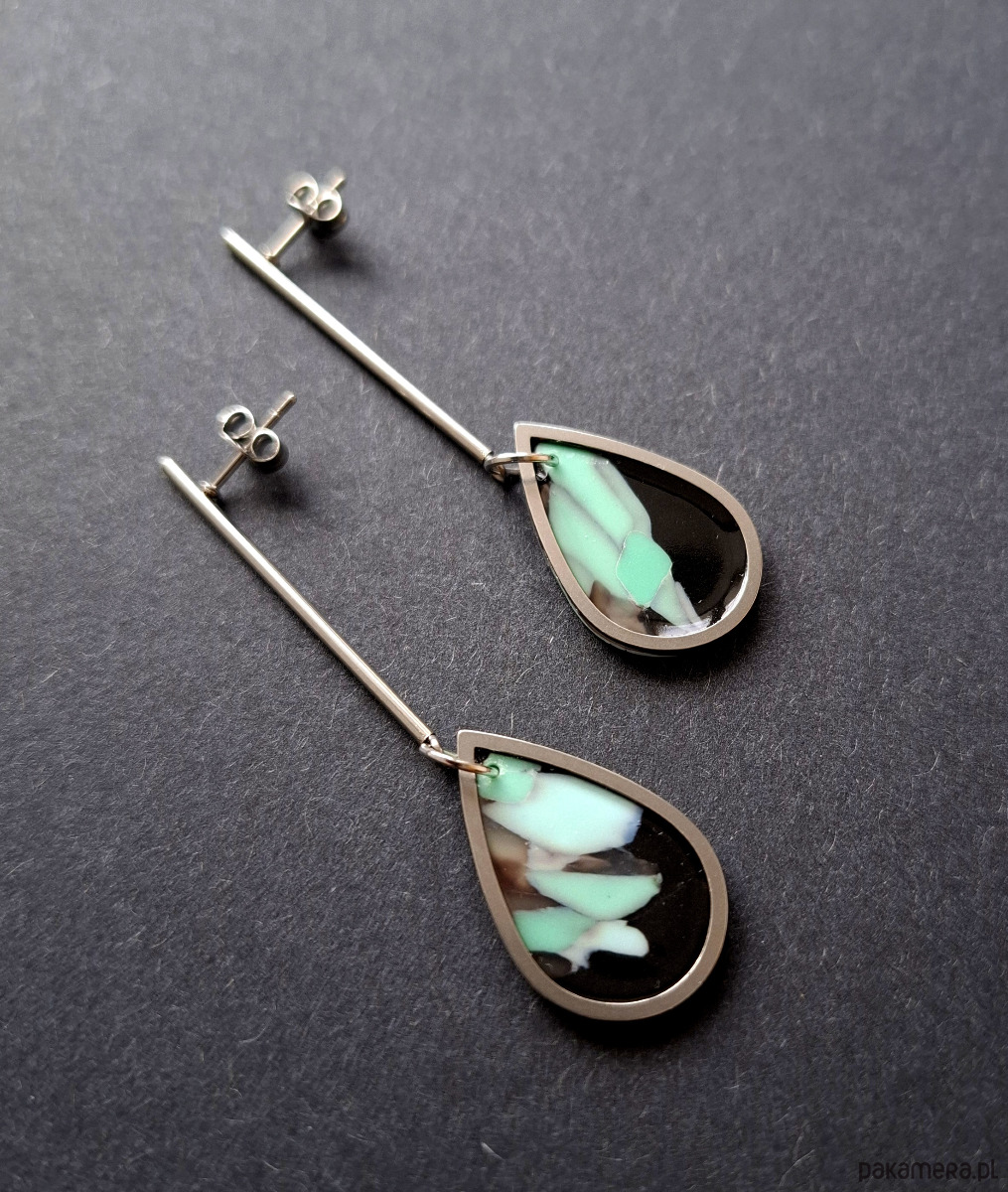 Kolczyki na sztyfty wykonane z wysokiej jakości glinki polimerowej i dodatkiem ozdobnych elementów metalowych. Sztyfty proste posrebrzane i nieuczulające. Kolczyki jednostronne i lekkie. Wymiary: długość całkowita - 6,4 cm, szerokość 1,5 cm. Wykonane w jedynym egzemplarzu.