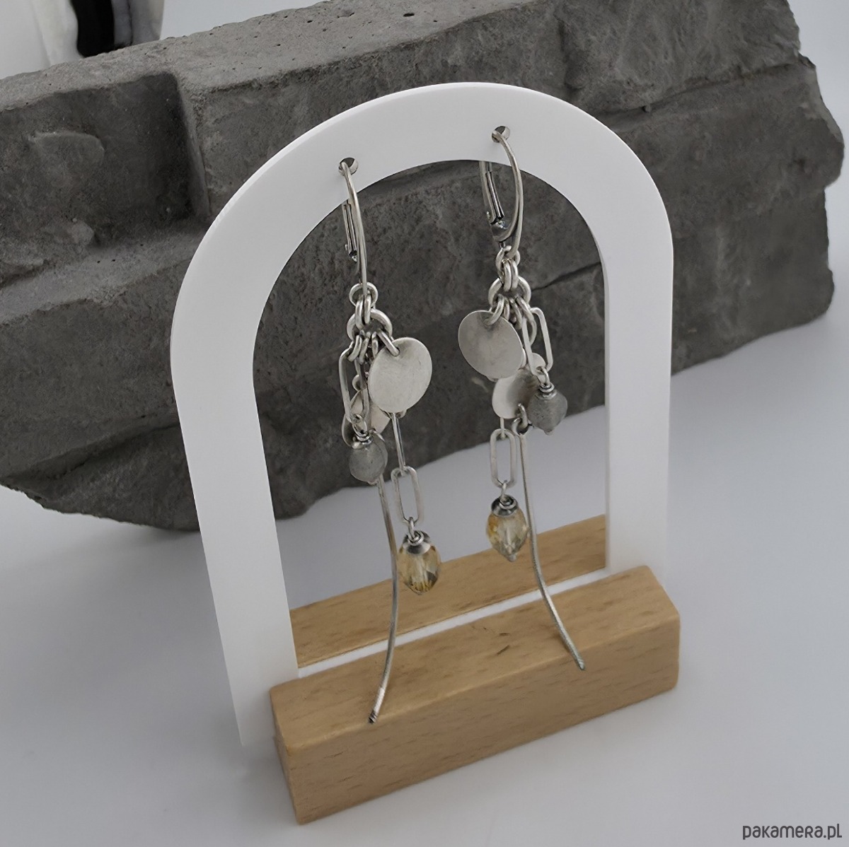 Modne, nowoczesne i oryginalne kolczyki. Wykonane w całości z oksydowanego srebra próby 925 oraz fasetowanych monet labradorytu wielkości ok. 0,6 cm i fasetowanych kropli cytrynu wielkości 8 mm. Lekkie i zwiewne. Całkowita długość kolczyków to ok. 9 cm. Ozdobnie zapakowane.