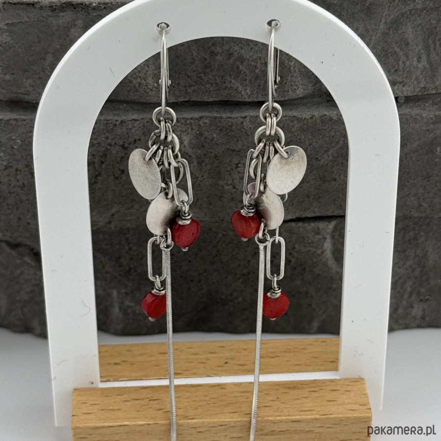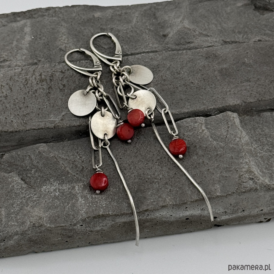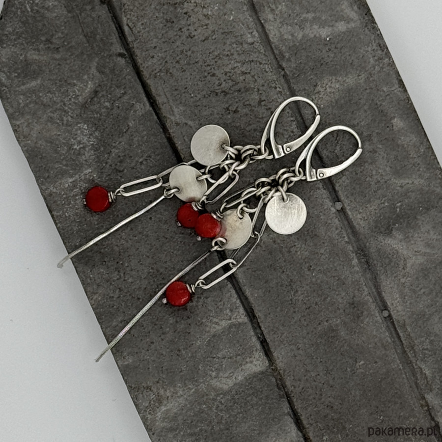 Modne, nowoczesne i oryginalne kolczyki. Wykonane w całości z oksydowanego srebra próby 925 oraz monetek czerwonego korala wielkości ok. 0,6 cm. Lekkie i zwiewne. Całkowita długość kolczyków to ok. 9 cm. Ozdobnie zapakowane.