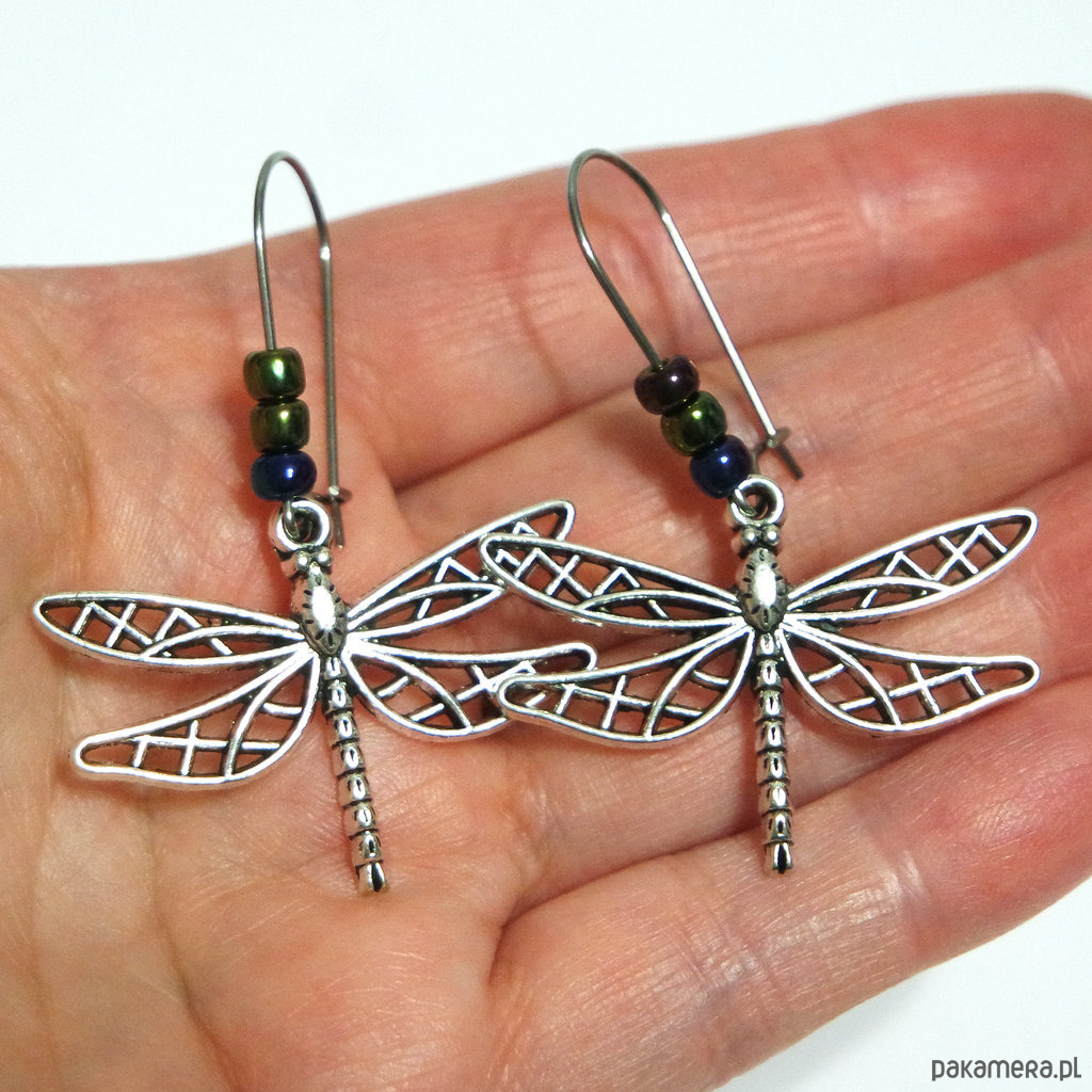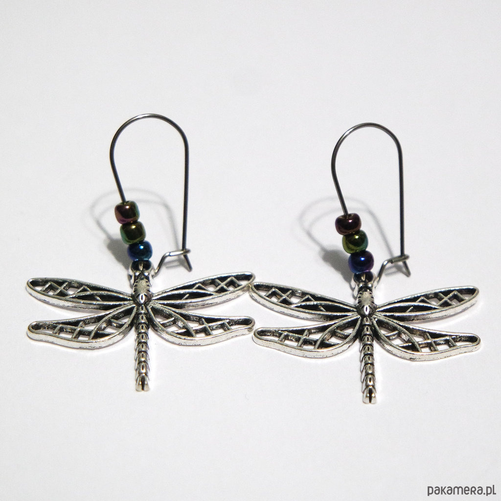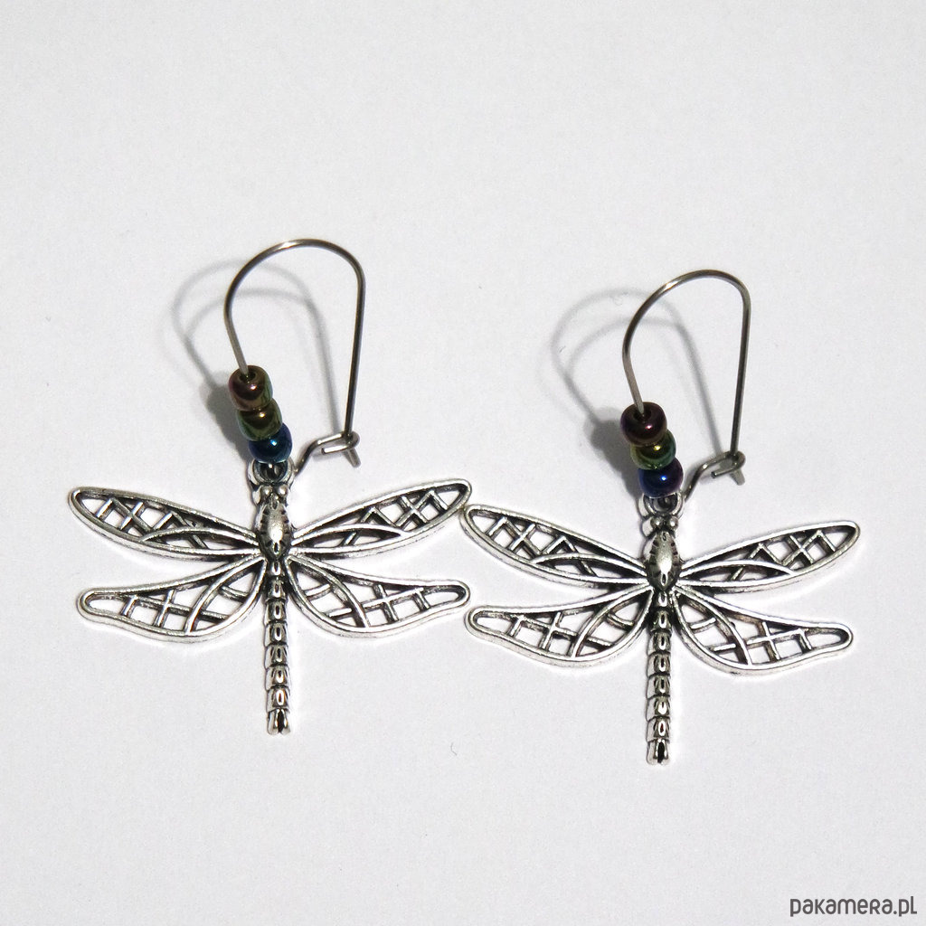 Kolczyki z pięknymi zawieszkami w kształcie ważki i koralikami.