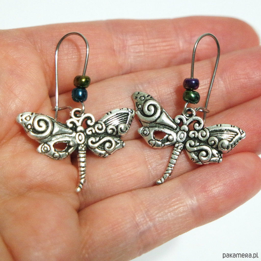 Kolczyki z pięknymi zawieszkami w kształcie ważki i koralikami.