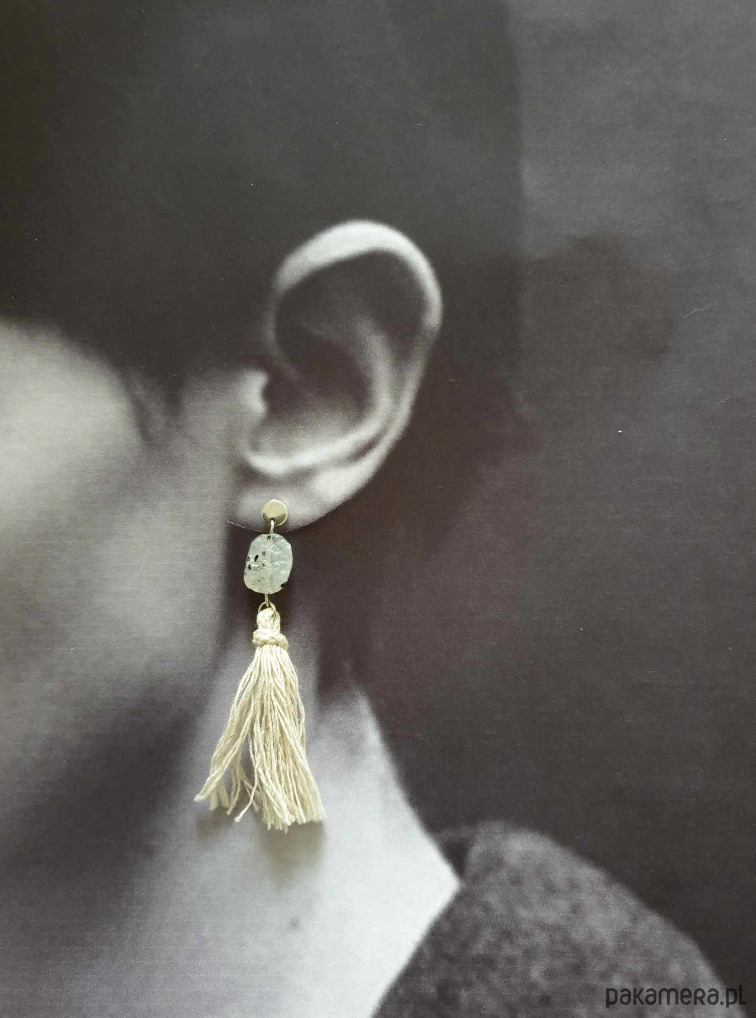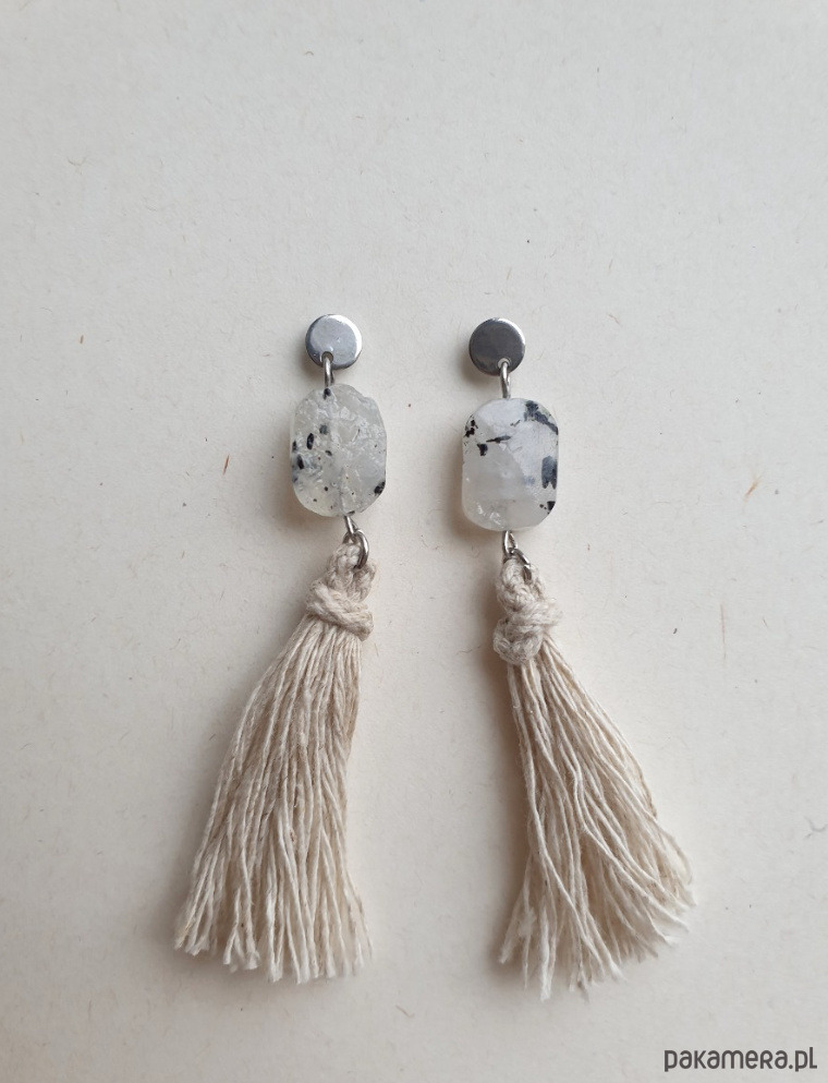 Kolczyki z kolekcji Węzły. Proste, podłużne kolczyki i bardzo lekkie, idealne na wieczorne wyjście ale też na co dzień, z kamieniem księżycowym i lnianym chwostem. Na zdjęciu przykładowa para, kolczyki które kupujesz będą się minimalnie różnić bo każdy kamień jest wyjątkowy.