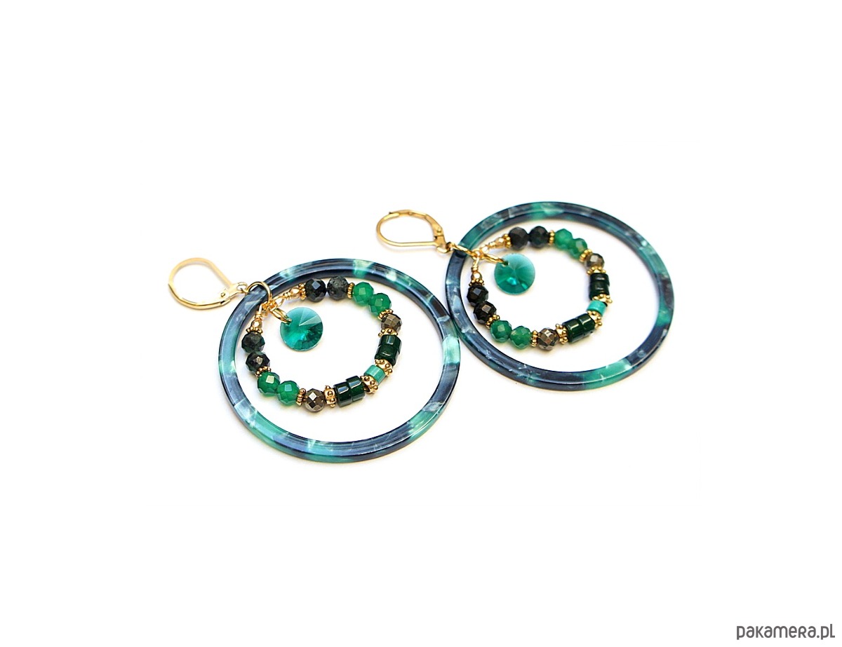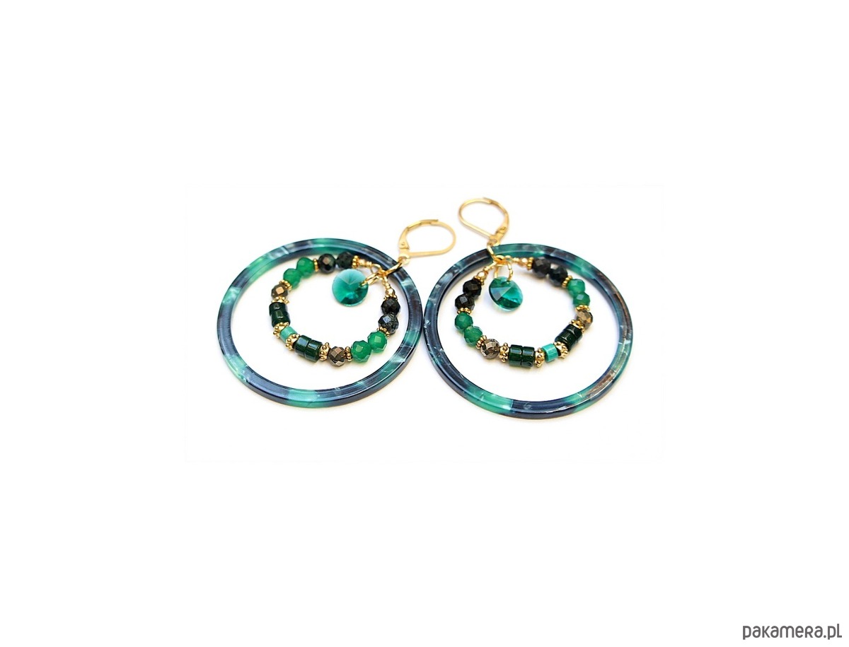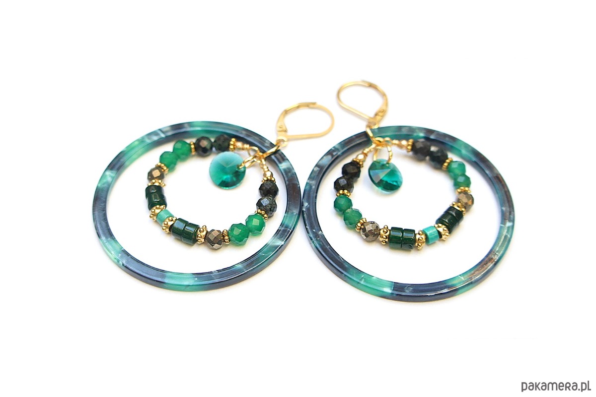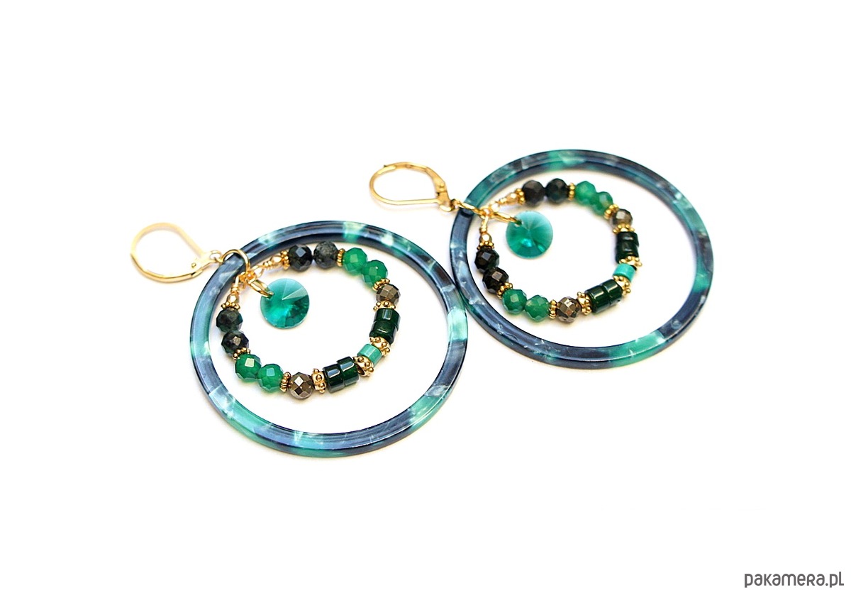 Kolczyki wykonane ze stali szlachetnej pokrytej zlotem oraz naturalnych minerałów: szmaragdy [4mm], onyks zielony [4mm], piryt [4mm], jadeit talarki [4x2mm], howlit talarki [4 x 2mm], dużych obręczy z żywicy oraz zawieszek ze szkła. Średnica kół 44mm oraz 28mm . Całkowita długość kolczyków 6,2cm. Biżuteria ozdobnie zapakowana.