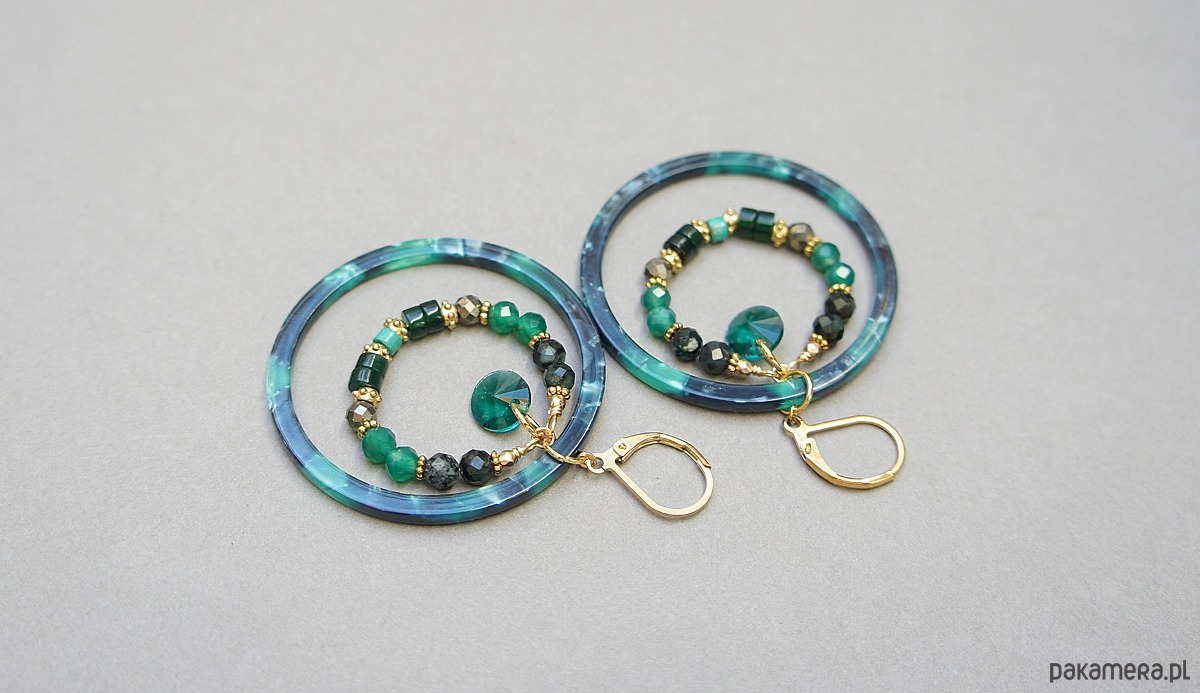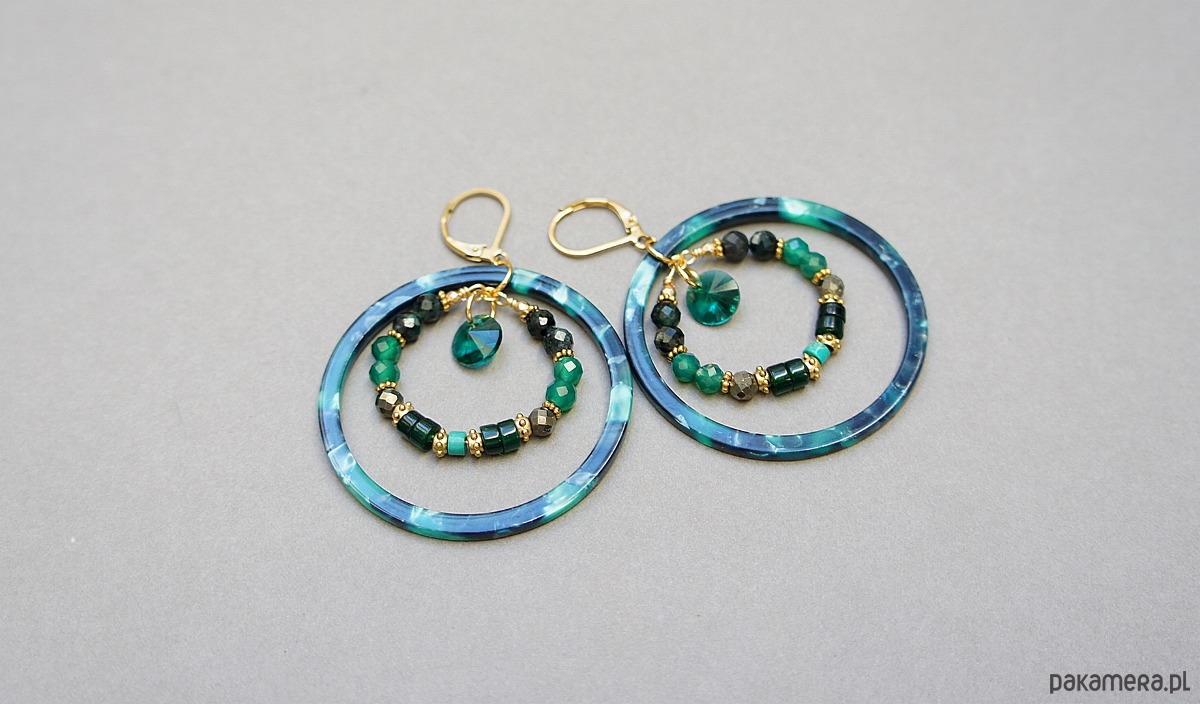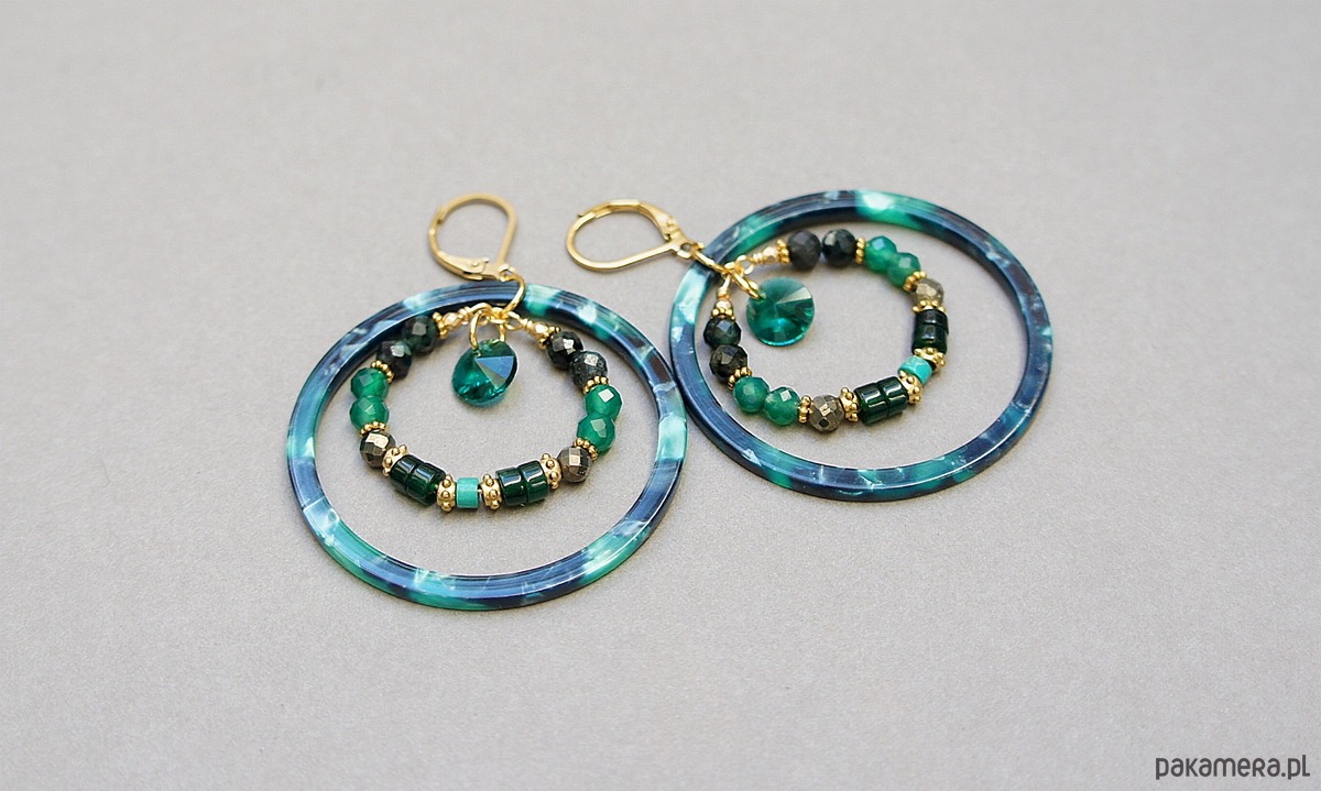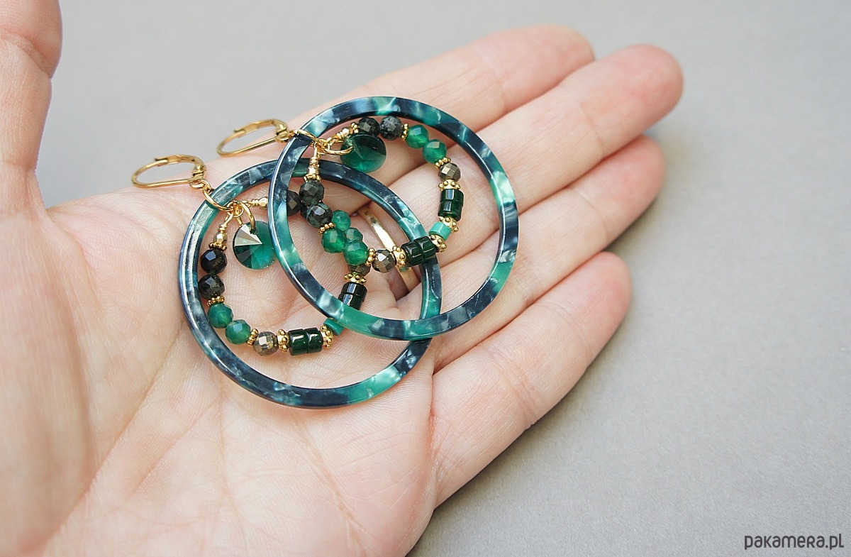 Kolczyki wykonane ze stali szlachetnej pokrytej zlotem oraz naturalnych minerałów: szmaragdy [4mm], onyks zielony [4mm], piryt [4mm], jadeit talarki [4x2mm], howlit talarki [4 x 2mm], dużych obręczy z żywicy oraz zawieszek ze szkła. Średnica kół 44mm oraz 28mm . Całkowita długość kolczyków 6,2cm. Biżuteria ozdobnie zapakowana.