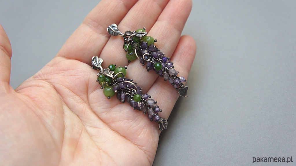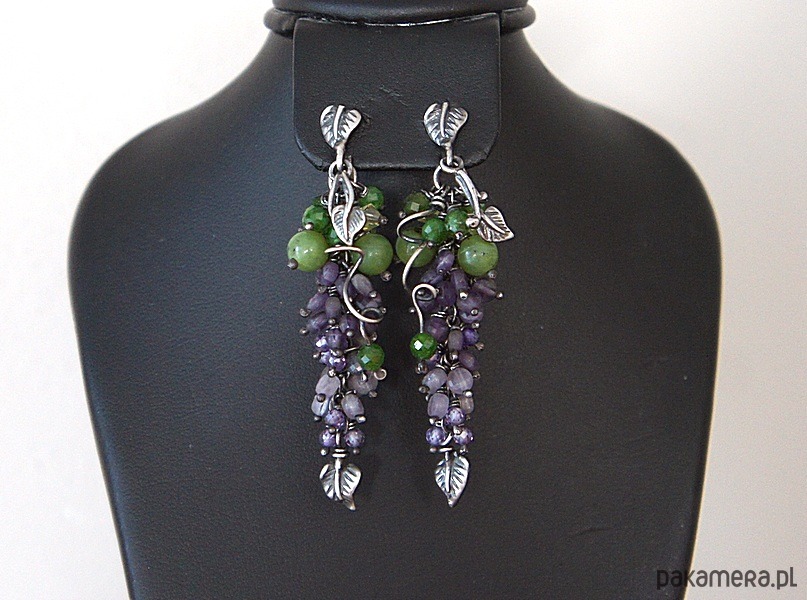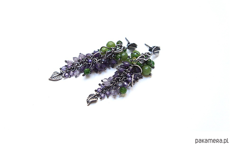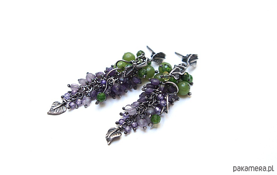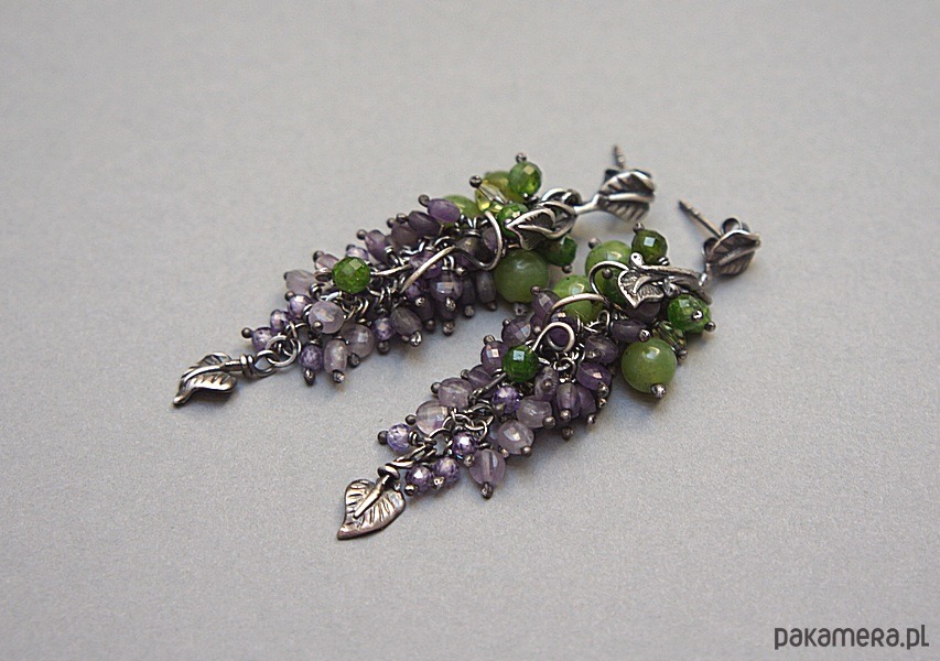 Kolczyki wykonane ze srebra [pr. 925] w połączeniu z fasetowanymi kuleczkami diopsytów [4mm], kuleczkami nefrytów [6mm], kryształkami Swarovskiego [4mm], fasetowanymi pastylkami ametystów [4mm], cyrkoniami [3mm] oraz roślinnymi motywami: bigle i liście. Gronka liczą 88 sztuk kamieni. Całość oksydowana i przetarta. Całkowita długość kolczyków 6,3cm. Biżuteria ozdobnie zapakowana.