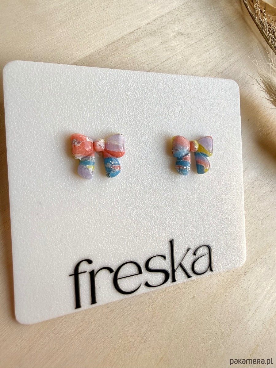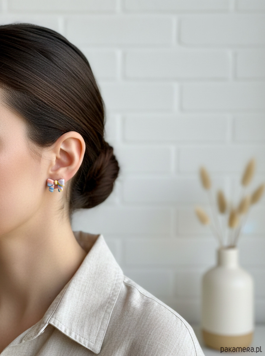 Kokardki w pastelowej palecie wprowadzają do stylizacji nutę dziewczęcego uroku i lekkości. Ręcznie formowane z gliny polimerowej, łączą w sobie pasma różu, błękitu, żółci i fioletu z delikatnym srebrnym połyskiem, a zamocowane są na bazie ze stali chirurgicznej, przyjaznej także dla wrażliwych uszu.