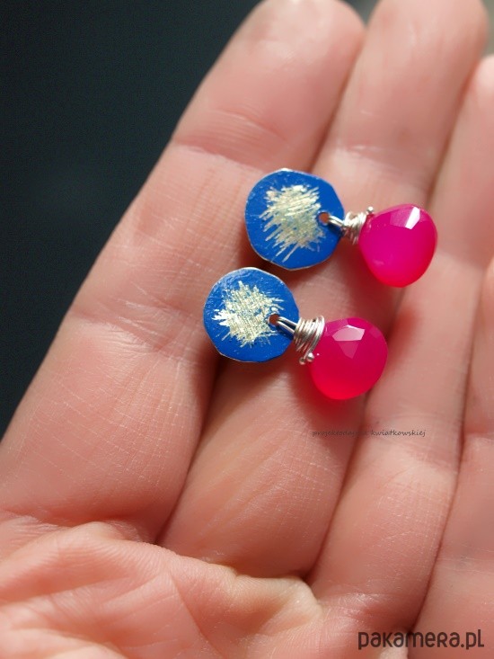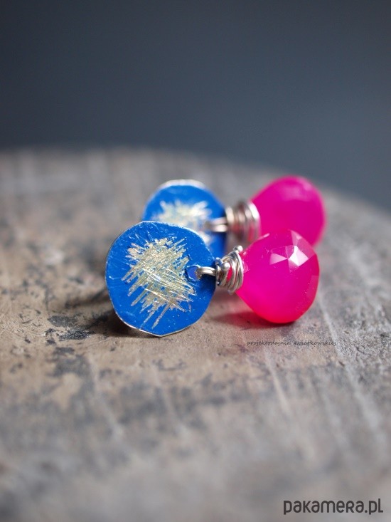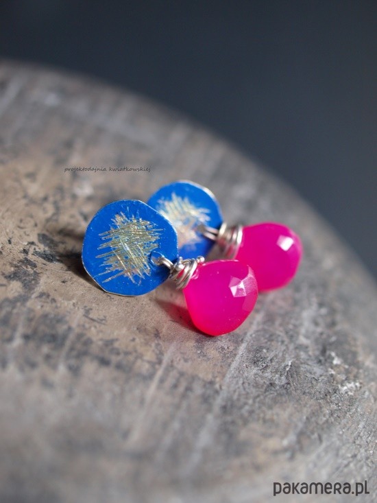 kolczyki - sztyfty; waga 2,85 g; mosiądz pokryty patyną 11/11 mm - przecierane, plus chalcedon w kolorze fuksja łza 10/9 mm; sztyfty i baranek srebrne. polecam