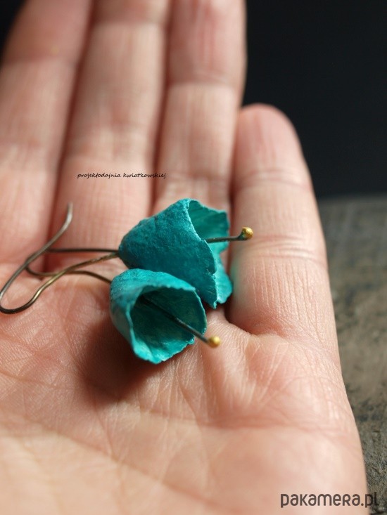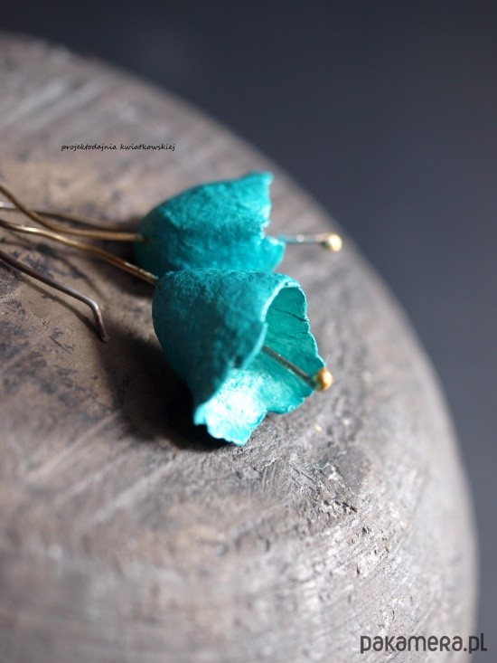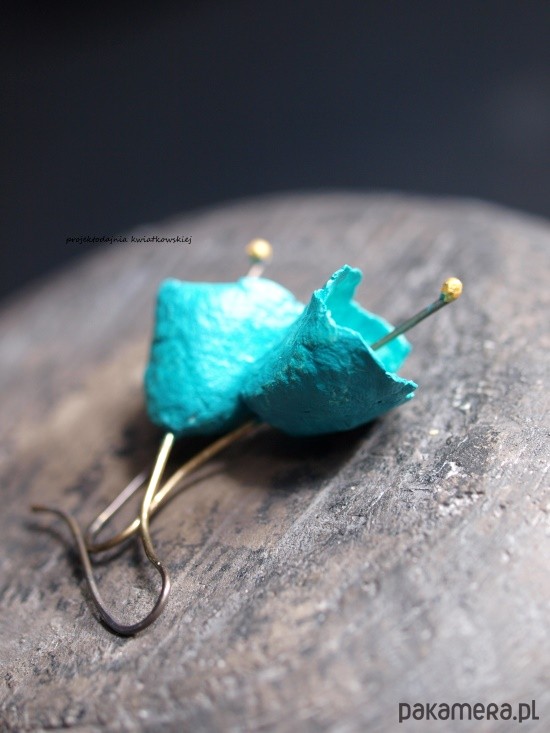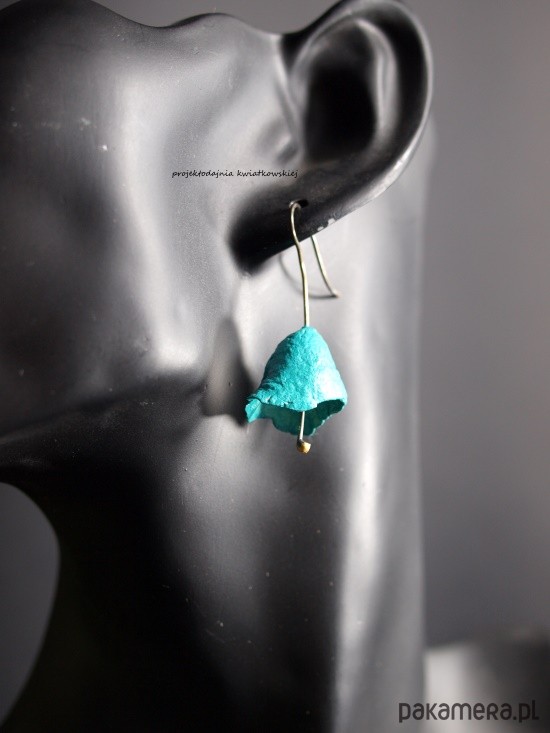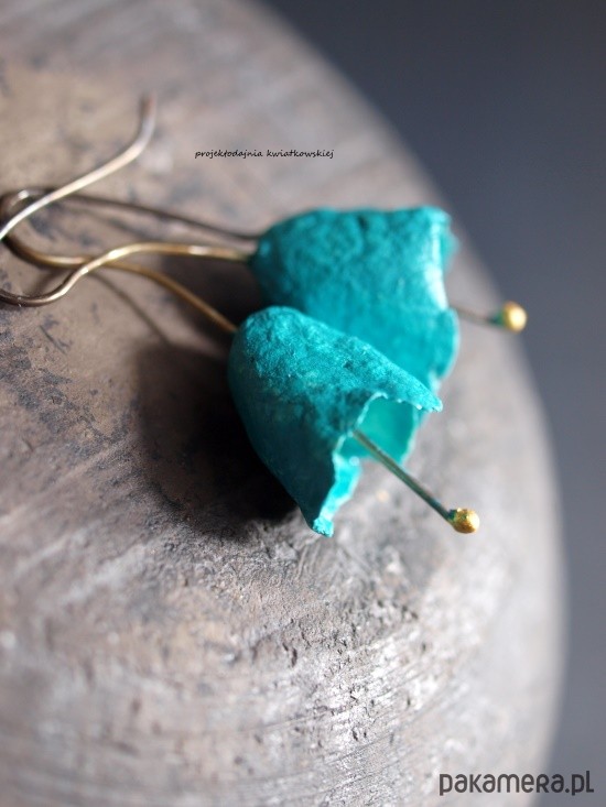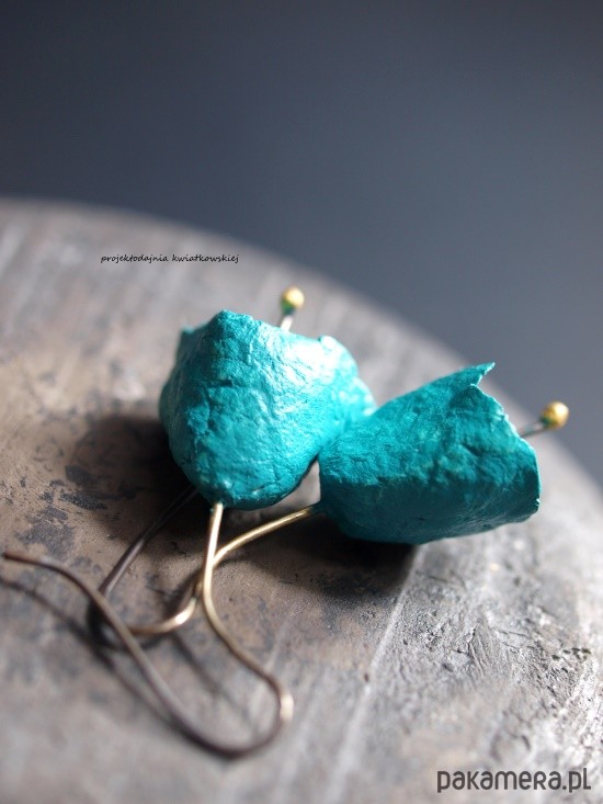 autorskie kolczyki, wykonane ze srebra, techniką cartapesta, w kolorach: turkus. zabezpieczone przed ścieraniem. długość całkowita 4 cm, waga 2,95 g. polecam