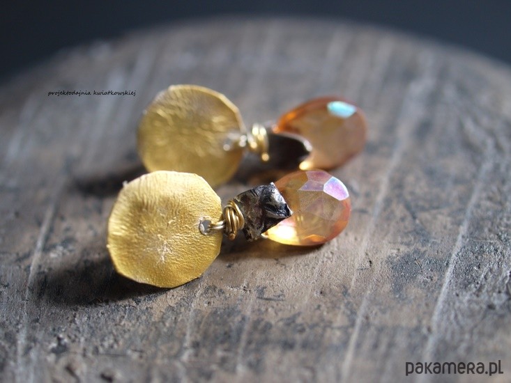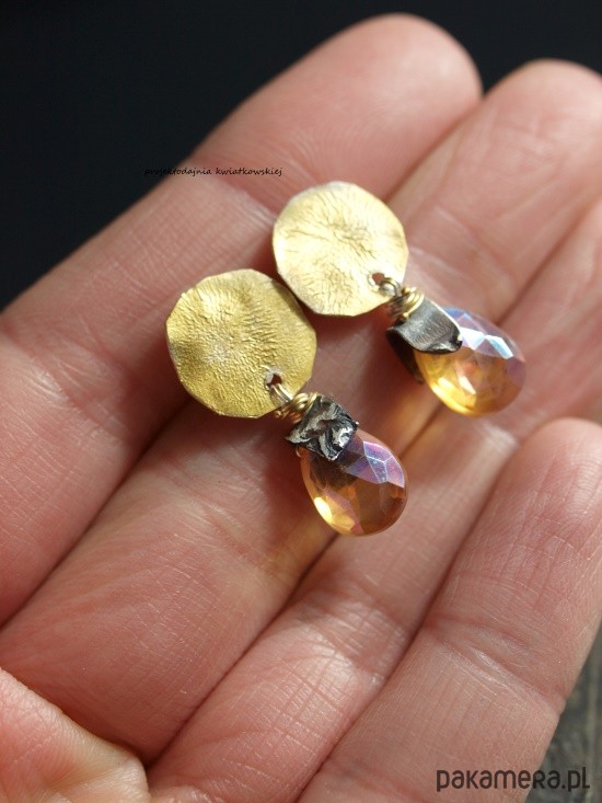 kolczyki - sztyfty; waga 4,32 g; część ze srebra przy uchu 12/13 mm, plus kwarc mistic orange briolette/łza - 10/8 mm owinięty w srebro. częściowo pokryte 14 k złotem, długość całkowita 2,7 cm. polecam