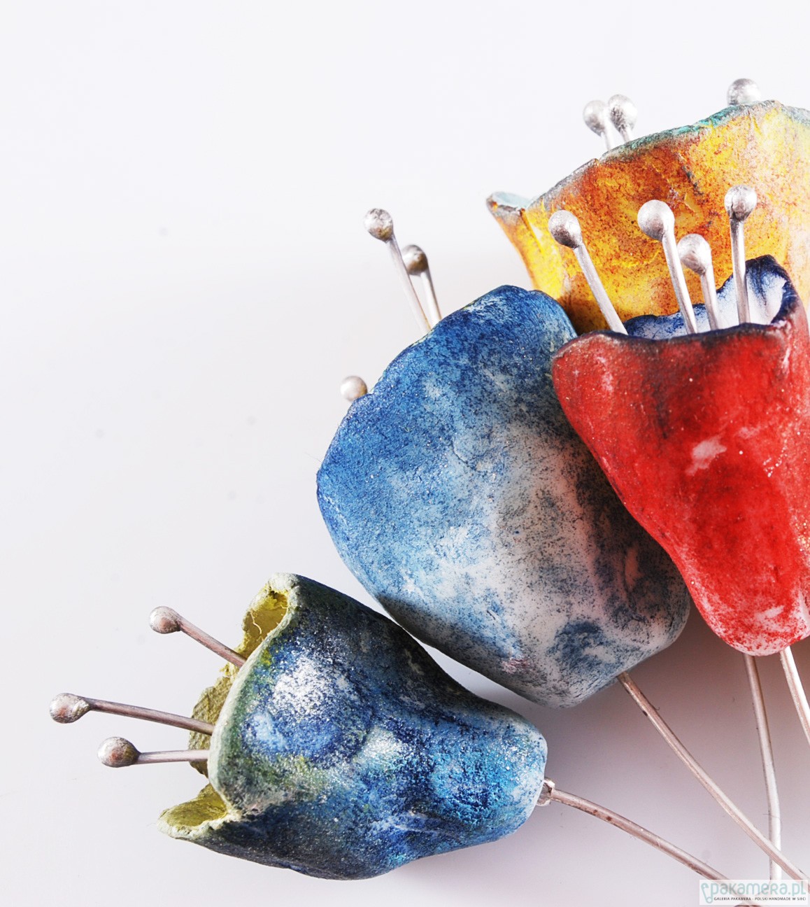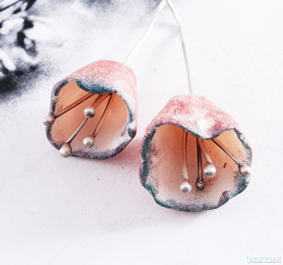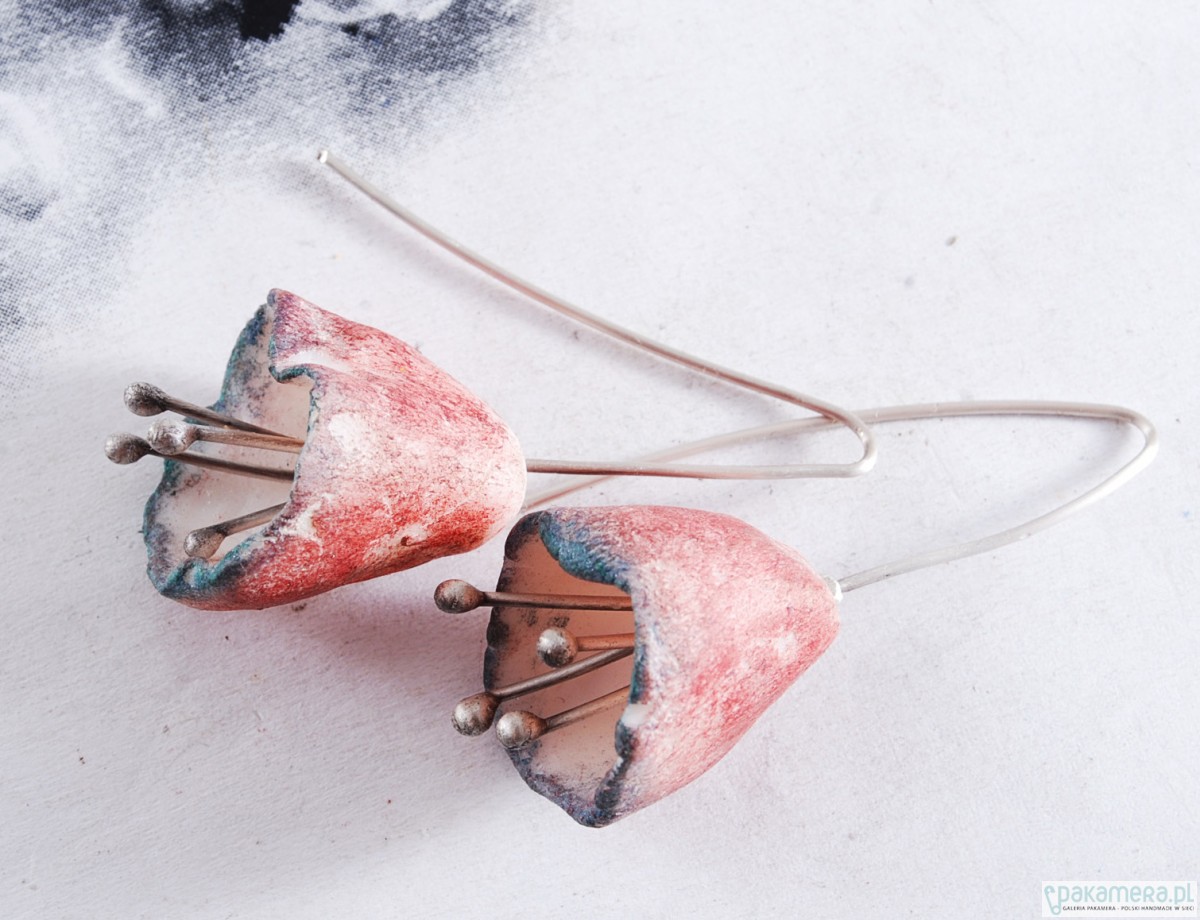 ZAMÓWIENIE - Kolczyki wykonane z porcelany pariańskiej, ręcznie formowanej i zdobionej specjalnymi woskami, oraz srebra próby 925. Od podstaw wykonane ręcznie w mojej pracowni. Technika pozwala na uzyskanie malarskich efektów przenikania kolorów. Kolczyki są lekkie, niezwykle dekoracyjne, celowo lekko asymetryczne, żeby nadać im organiczna formę. Długość 5 cm, waga kompletu 8 g. Porcelana wypalona w 1250 C, jest wytrzymała, twarda, miejscami przepuszcza delikatnie światło. Na ostatnim zdjęciu pokazane są inne kwiaty z kolekcji.