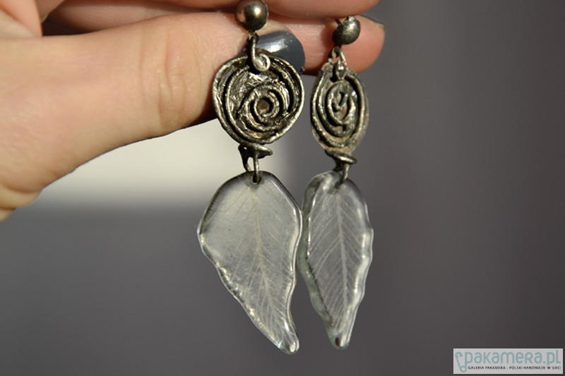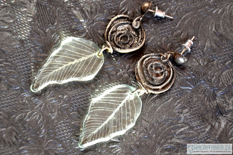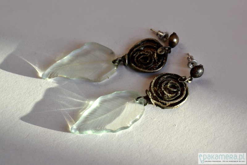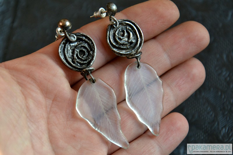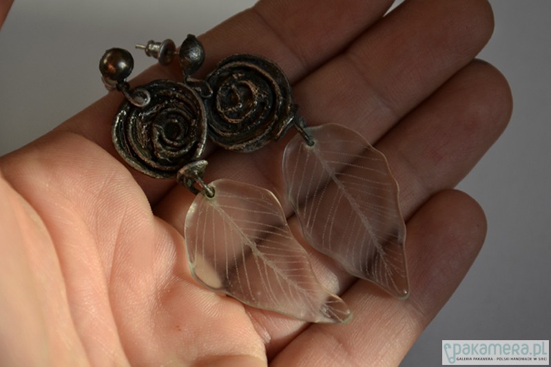 Delikatne długie kolczyki z transparentnymi szklanymi grawerowanymi listeczkami. Subtelne metalowe różyczki wykonane ręcznie. Długość całego kolczyka to ok. 6 cm.