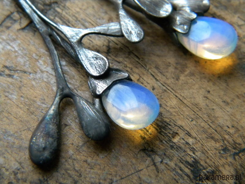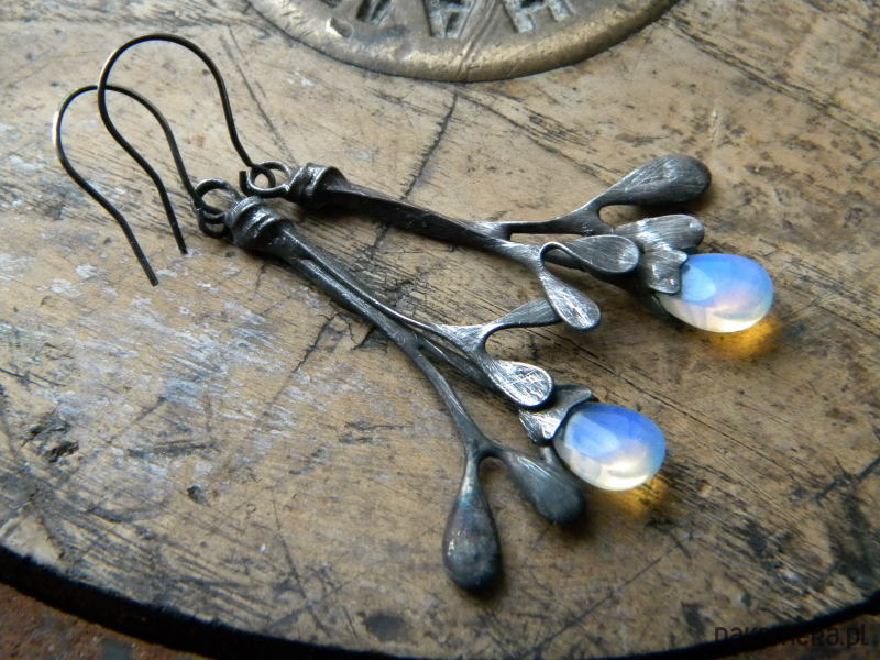 kolczyki ze szkła zwanego syntetycznym opalem.Oprawa z ocynowanej miedzi.
