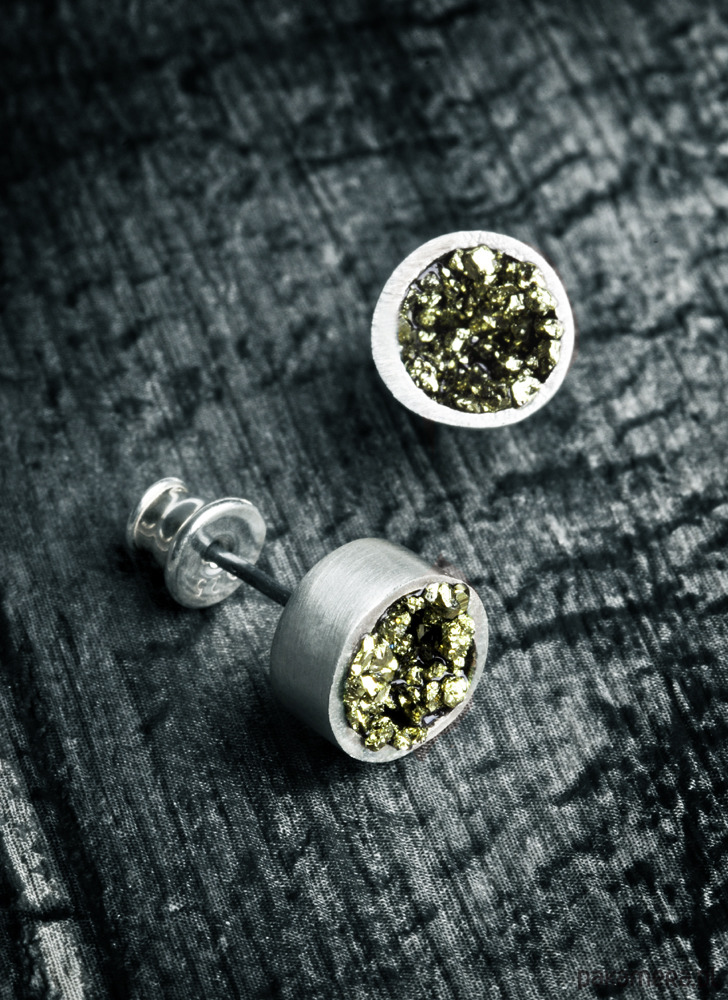 Uniwersalne, minimalistyczne kolczyki, wykonane ze srebra próby 925. Podkreślą charakter każdej kreacji. Dzięki swojej geometrycznej formie, są ponadczasowe. Idealne dla kobiet, które preferują skromną biżuterię. Wnętrze kolczyków wypełnia piryt, nadający piękne złote refleksy.