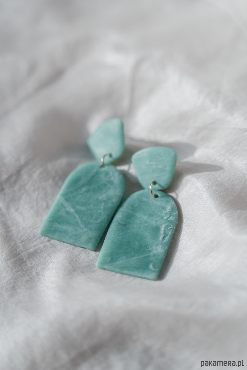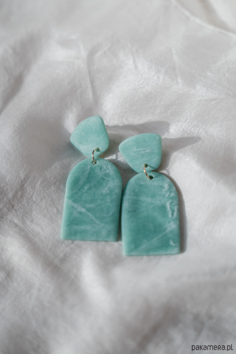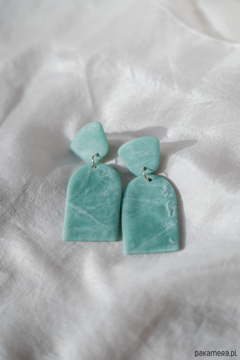 Wiszące kolczyki wykonane z gliny polimerowej i żywicy, na sztyfcie ze stali nierdzewnej.