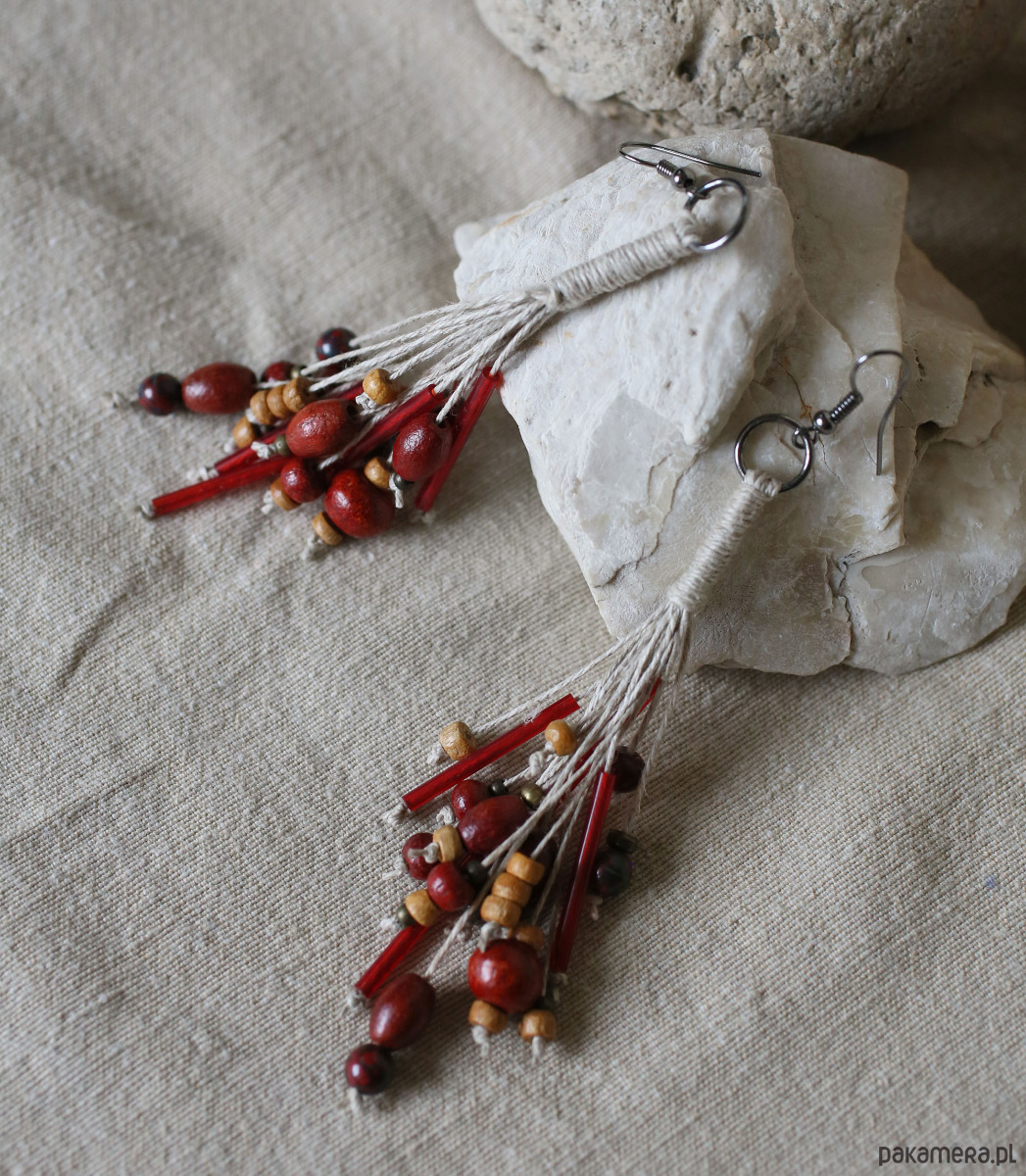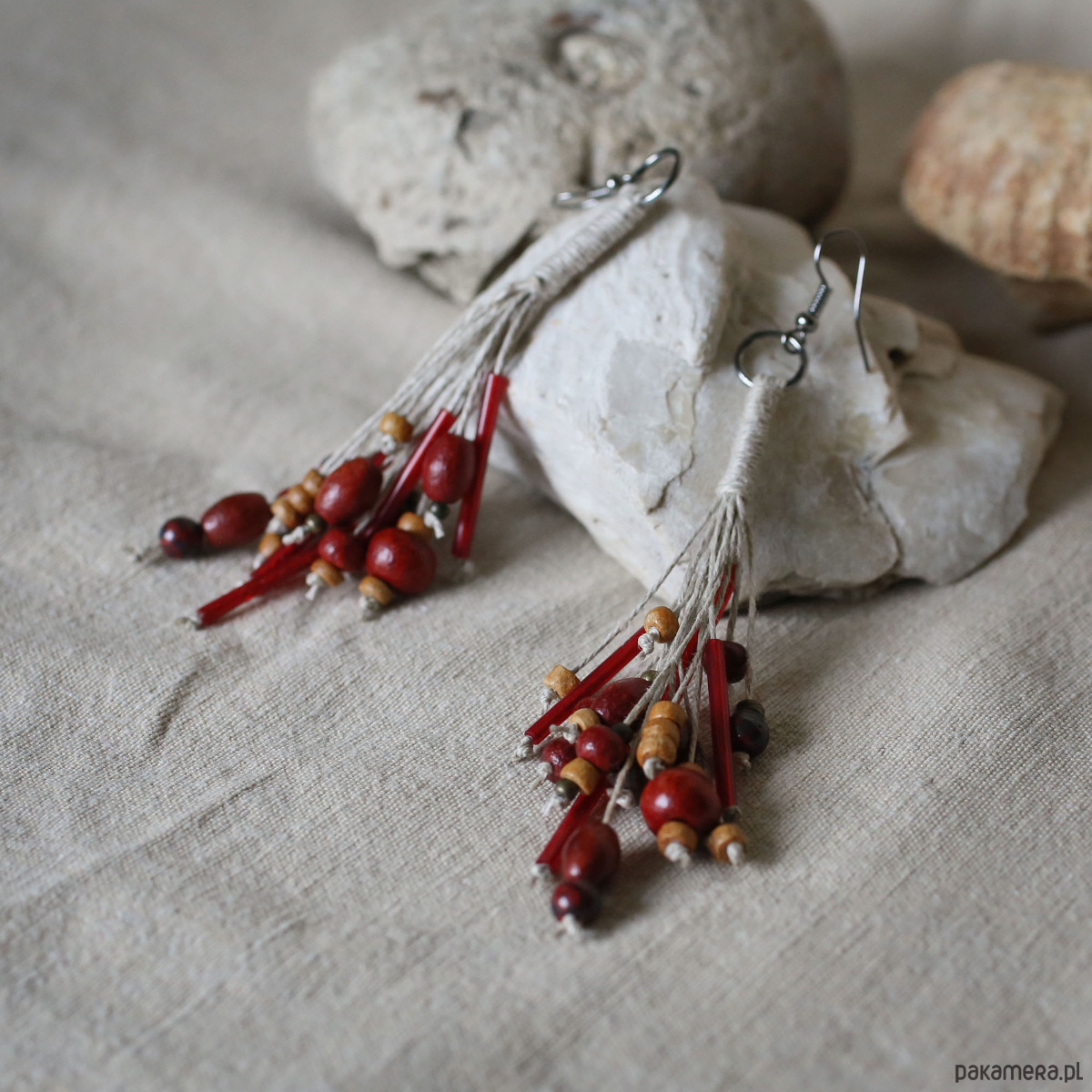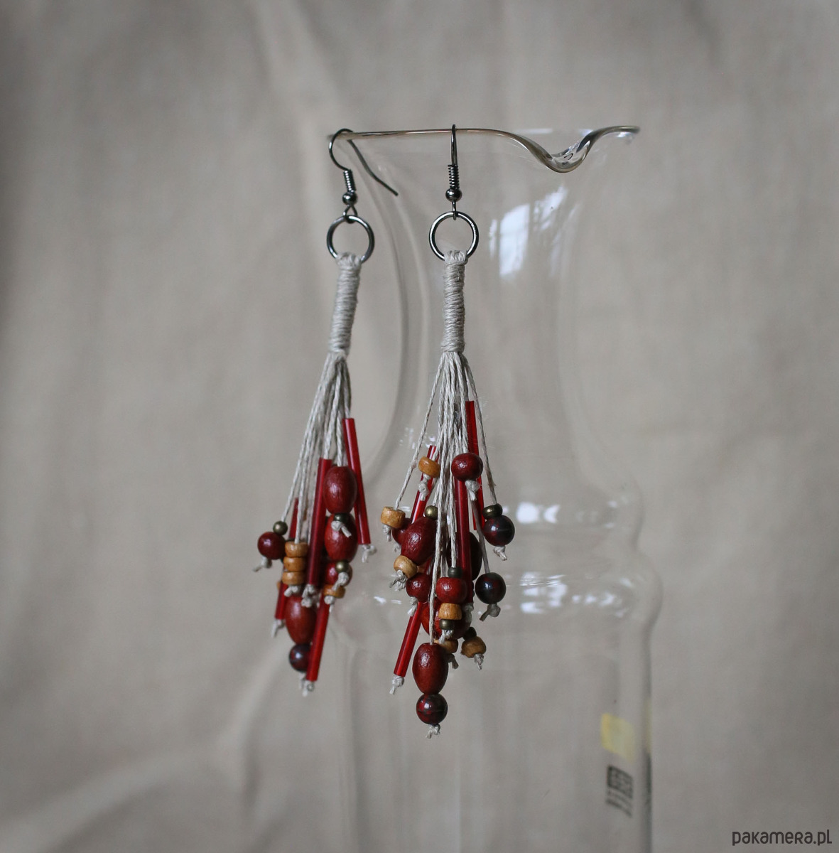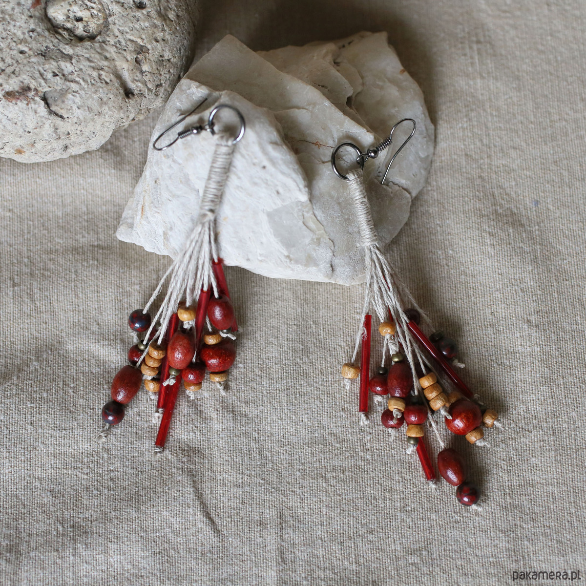 Kolczyki wiszące, w stylu boho, wykonane z różnorodnych koralików drewnianych, akrylowych i szklanych w tonacji głębokiej czerwieni. Bigle ze stali w kolorze antracytowym.