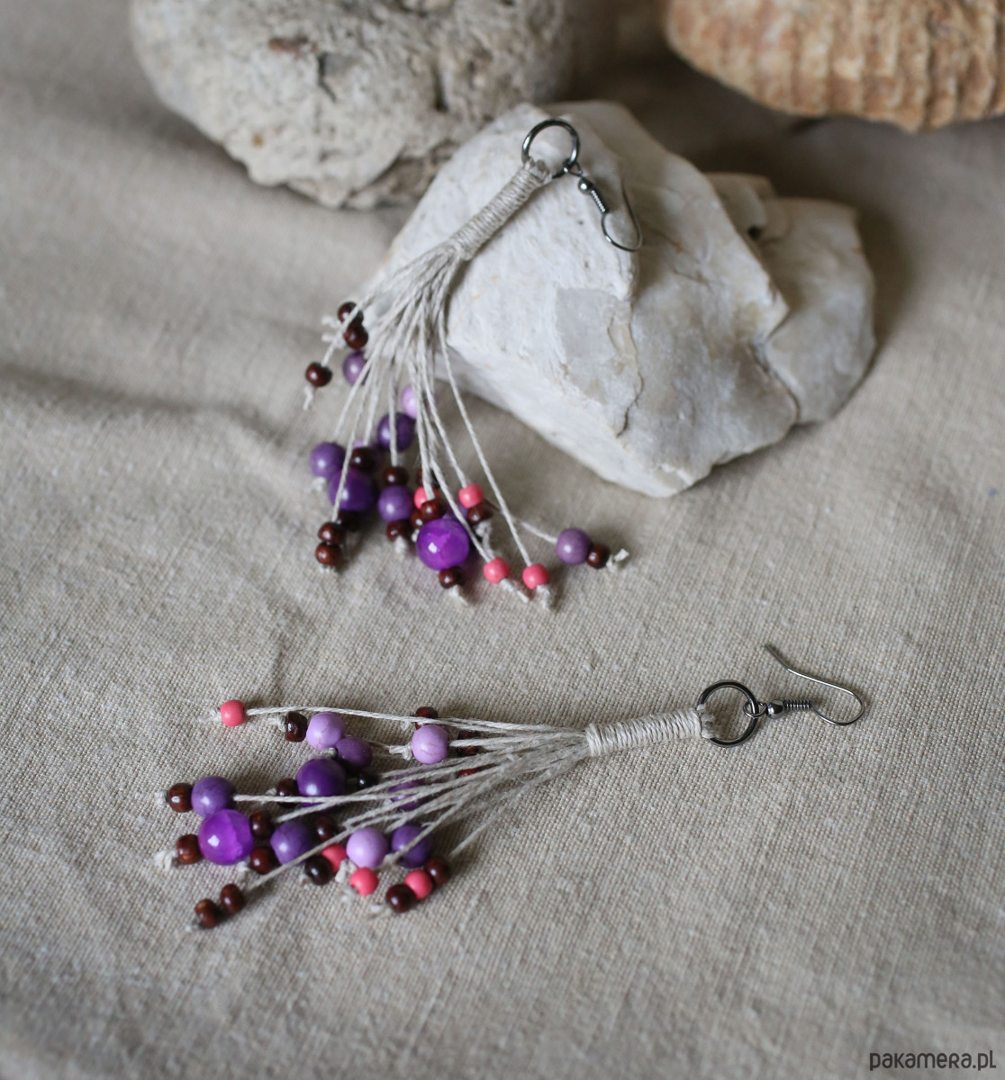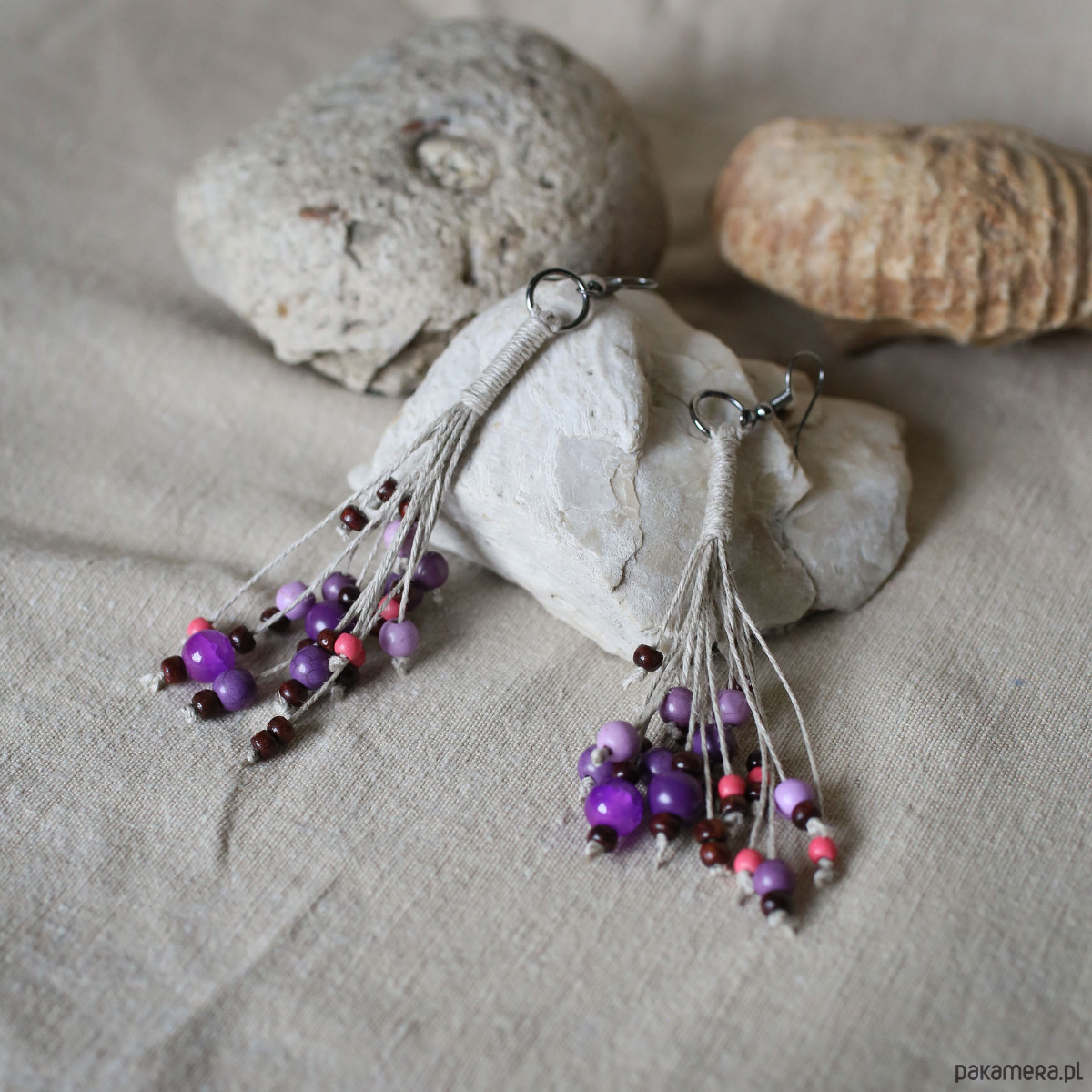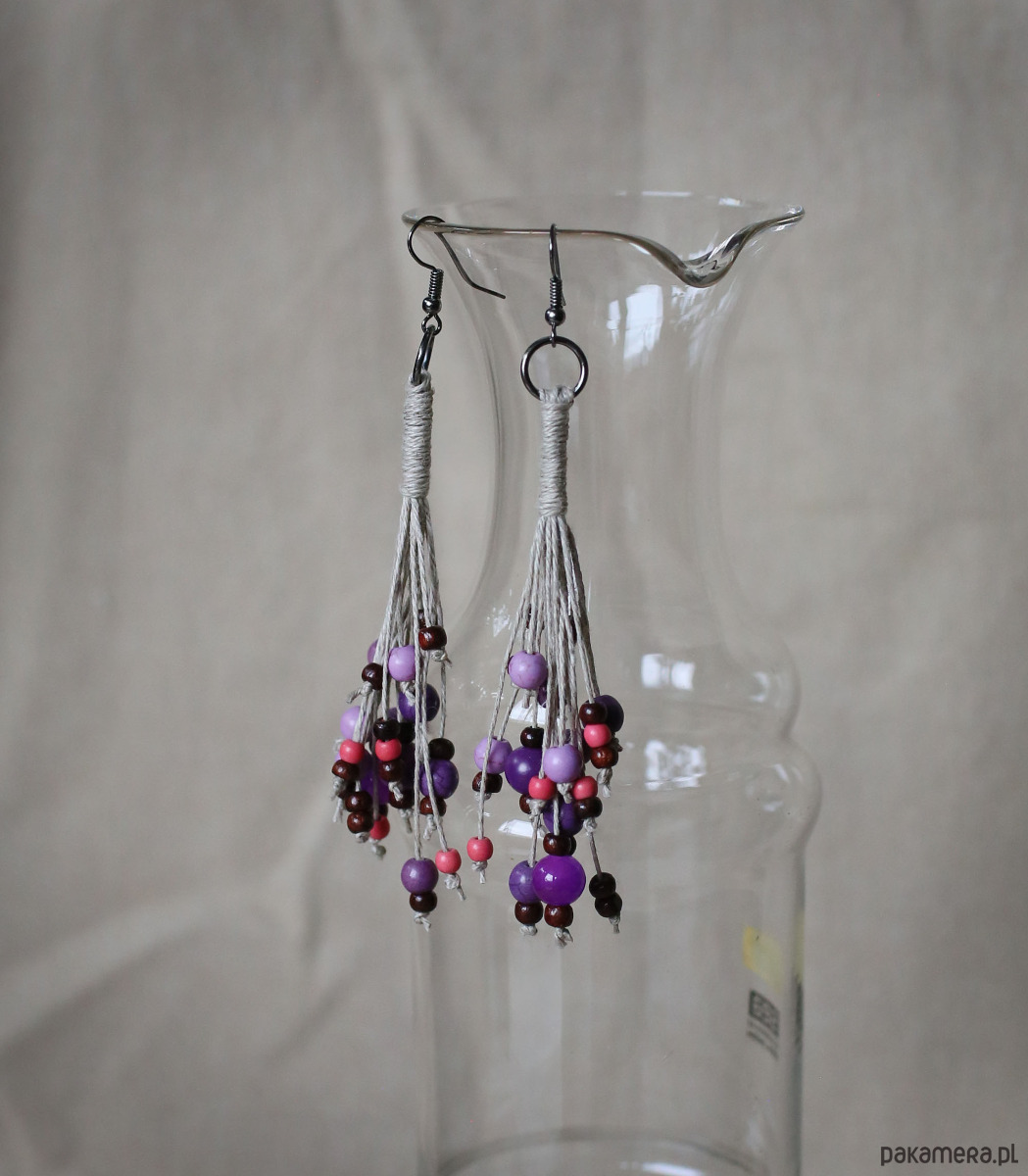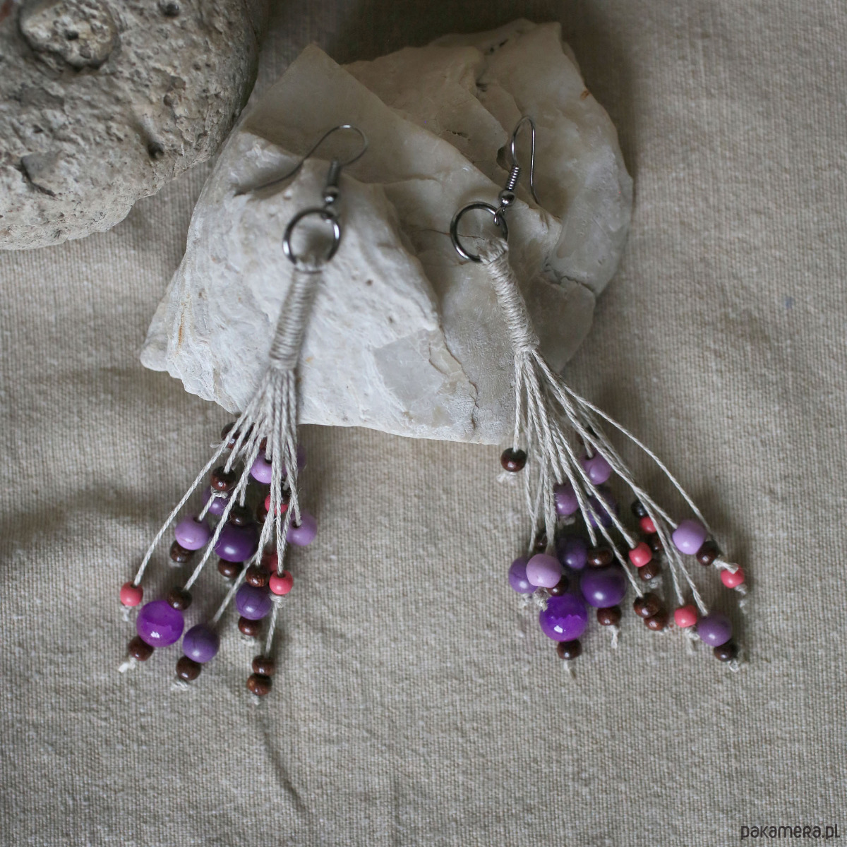 Kolczyki wiszące, w stylu boho, wykonane z różnorodnych koralików drewnianych, akrylowych i szklanych w tonacji fioletowej. Bigle ze stali w kolorze antracytowym.