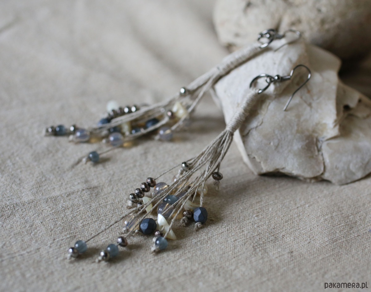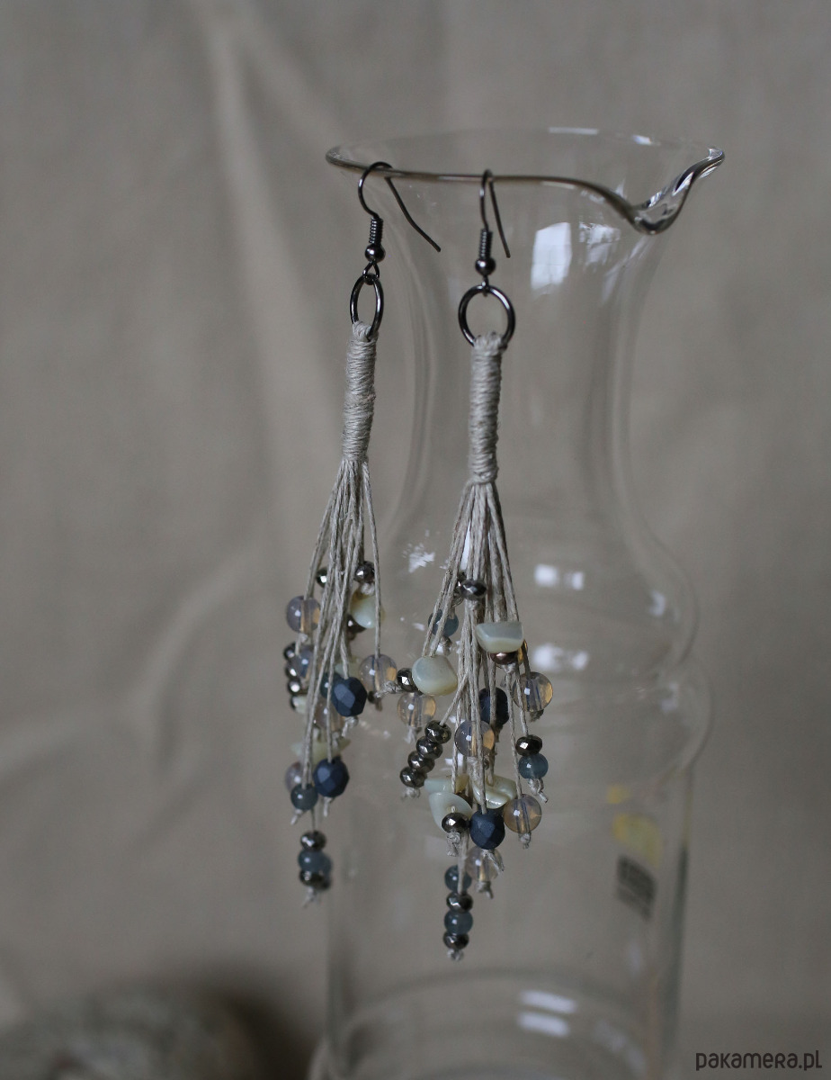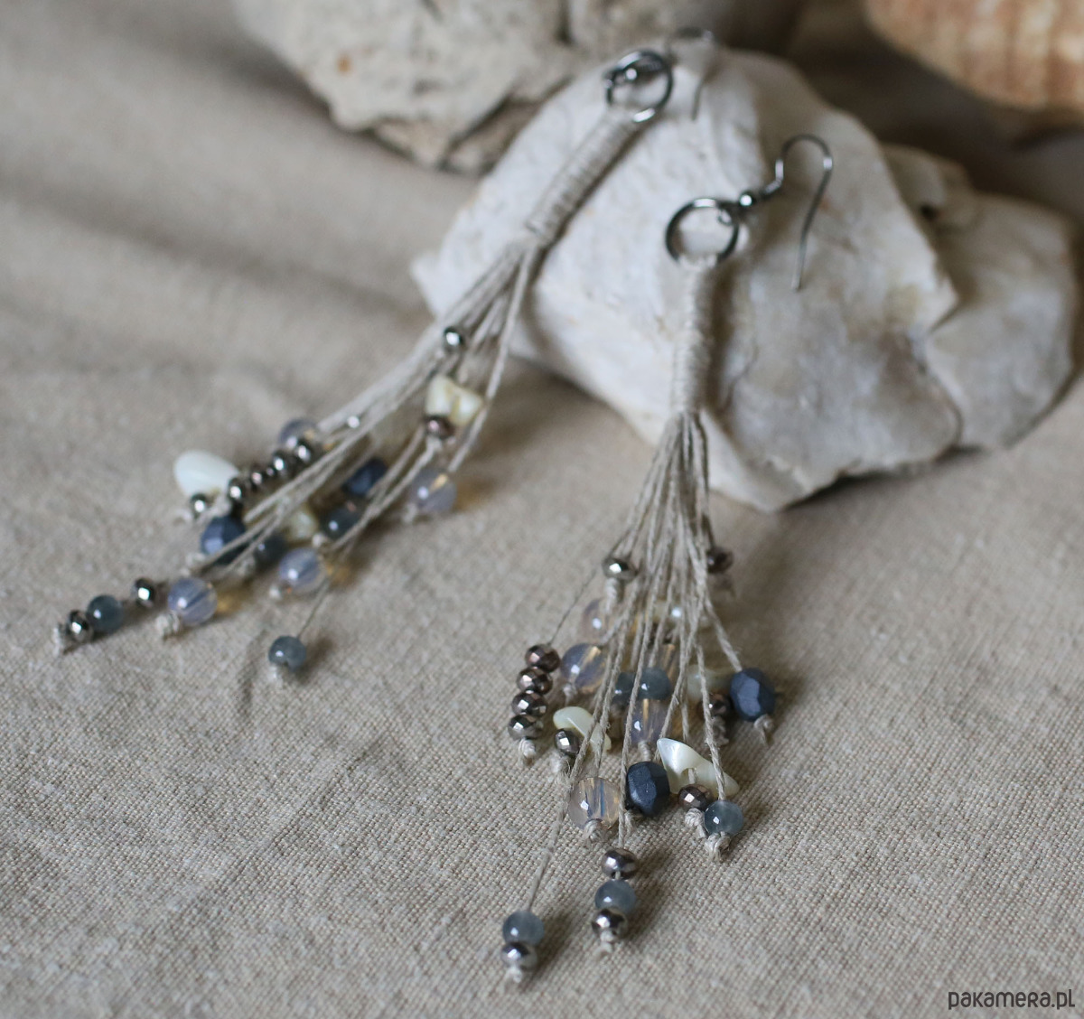 Kolczyki wiszące, w stylu boho, wykonane z różnorodnych koralików drewnianych, akrylowych i szklanych w tonacji srebrno-szarej. Bigle ze stali w kolorze antracytowym.