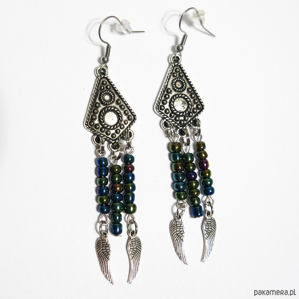 Kolczyki wykonane z ozdobnych zawieszek, mini skrzydeł i koralików szklanych.