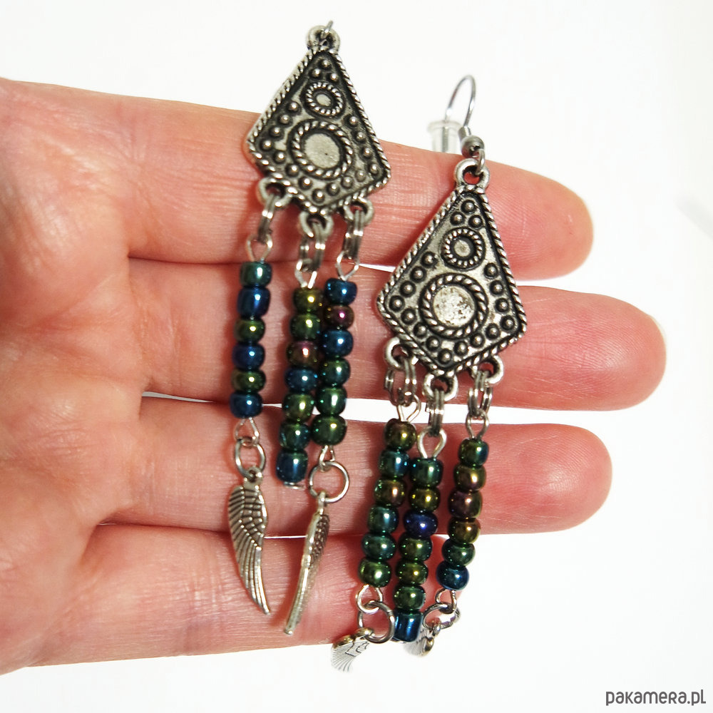 Kolczyki wykonane z ozdobnych zawieszek, mini skrzydeł i koralików szklanych.