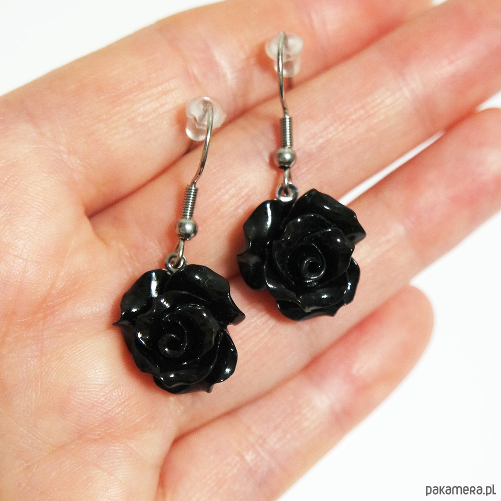 Kolczyki zawieszone na biglach otwartych ze stali szlachetnej. Długość ok.3,5 cm. Średnica róży w kolczykach ok.1,5 cm.