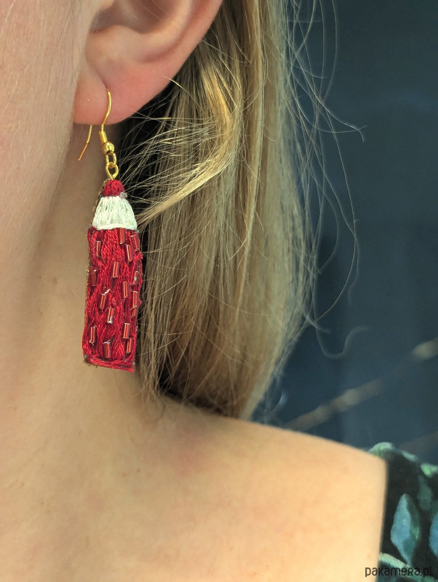Dodaj odrobinę kreatywności do swojej stylizacji dzięki tym wyjątkowym, ręcznie haftowanym kolczykom w kształcie czerwonych kredek. Błyszczące koraliki nadają im wyjątkowego uroku, a czerwony kolor przyciąga wzrok.