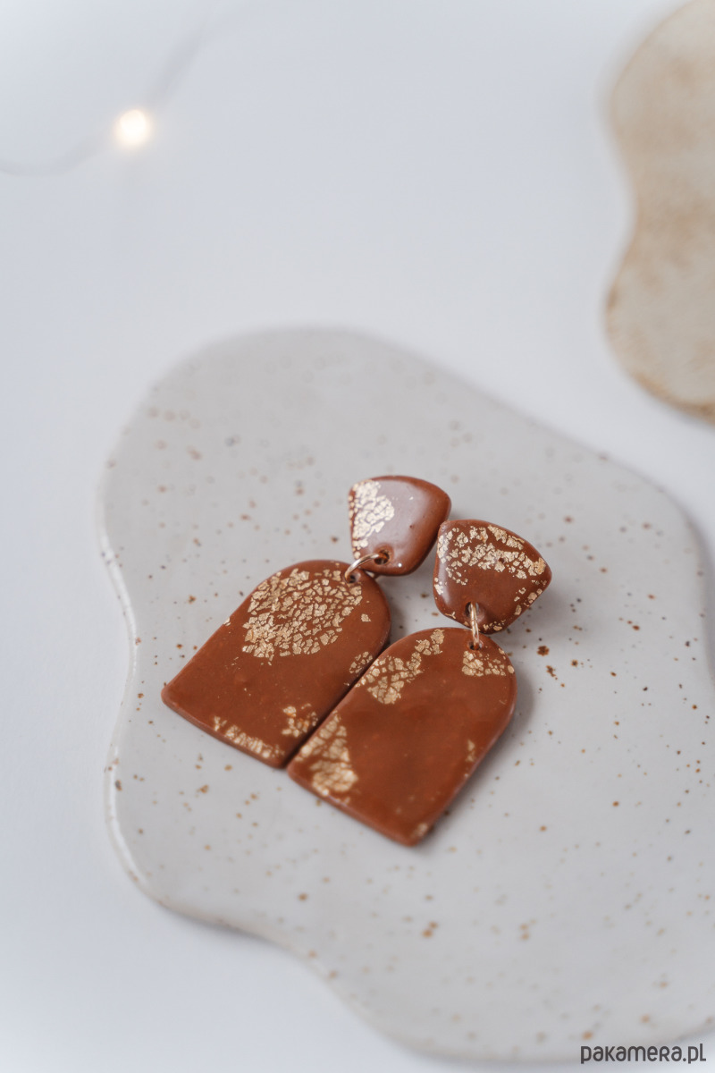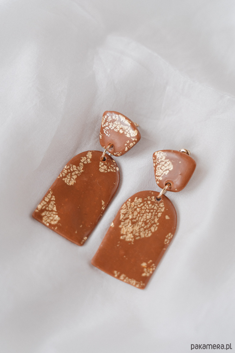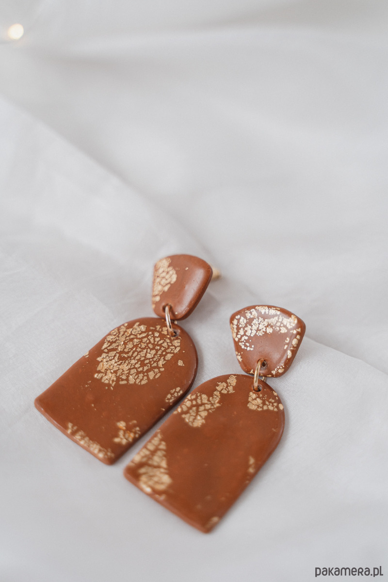 Wiszące kolczyki wykonane z gliny polimerowej i żywicy, na sztyfcie ze stali nierdzewnej.