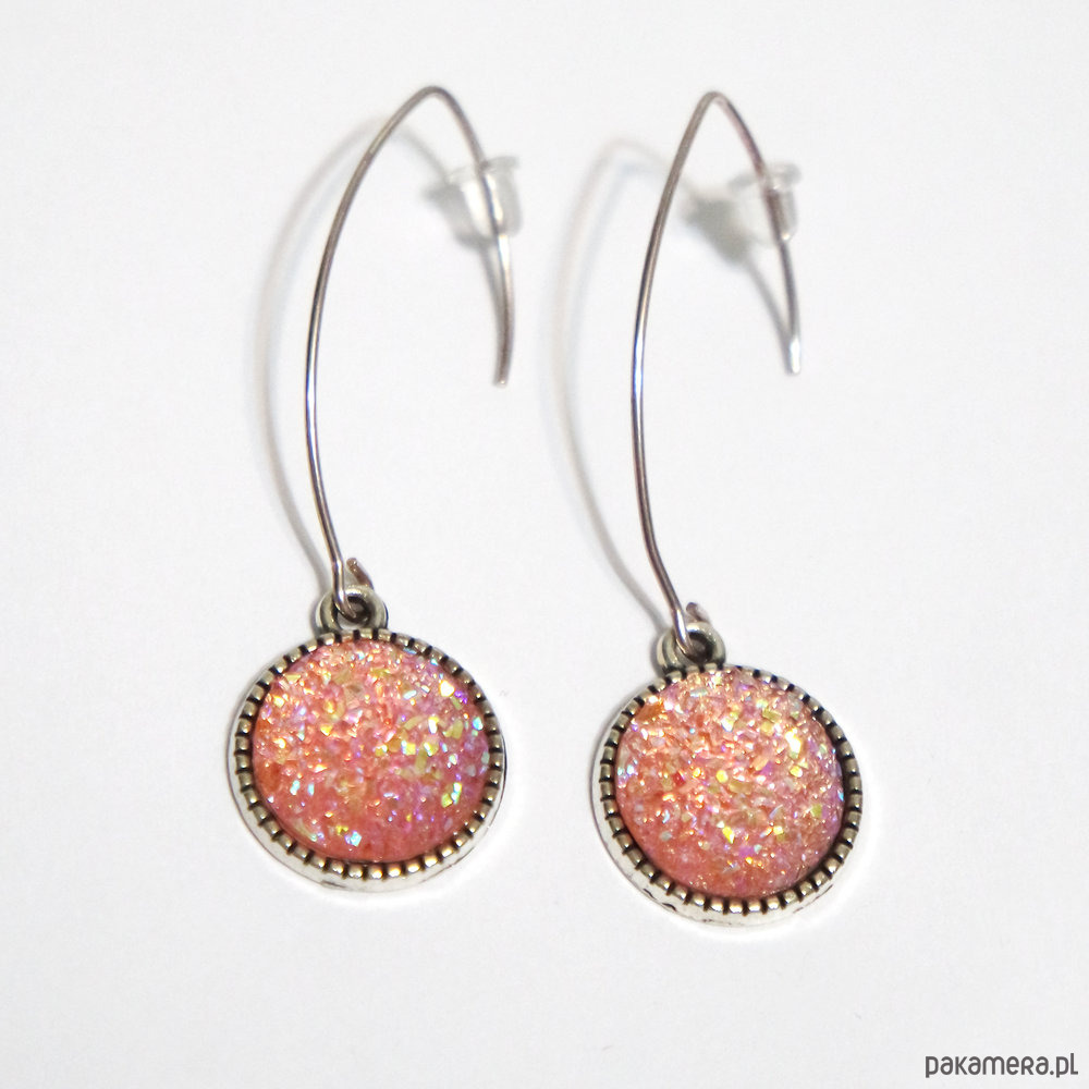 Unikatowe kolczyki z oczkiem z żywicy - druzy, mieniące się w odcieniach jasnego różu.