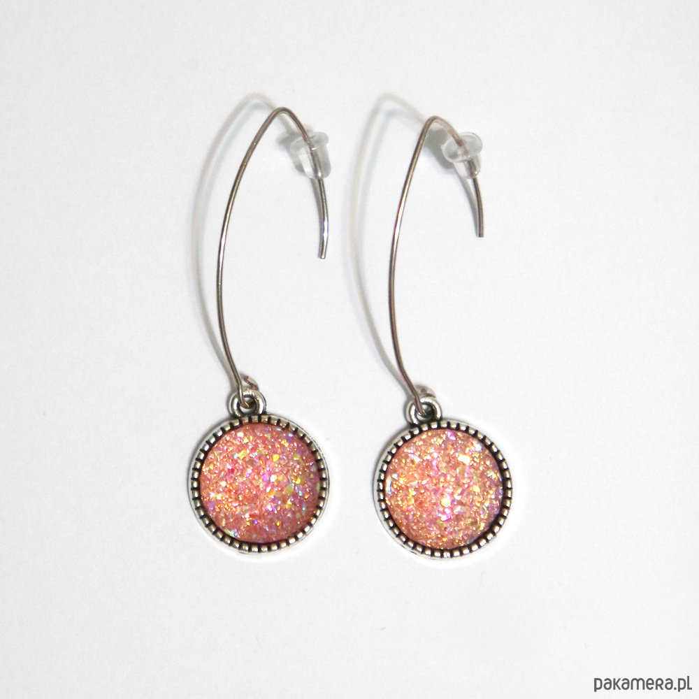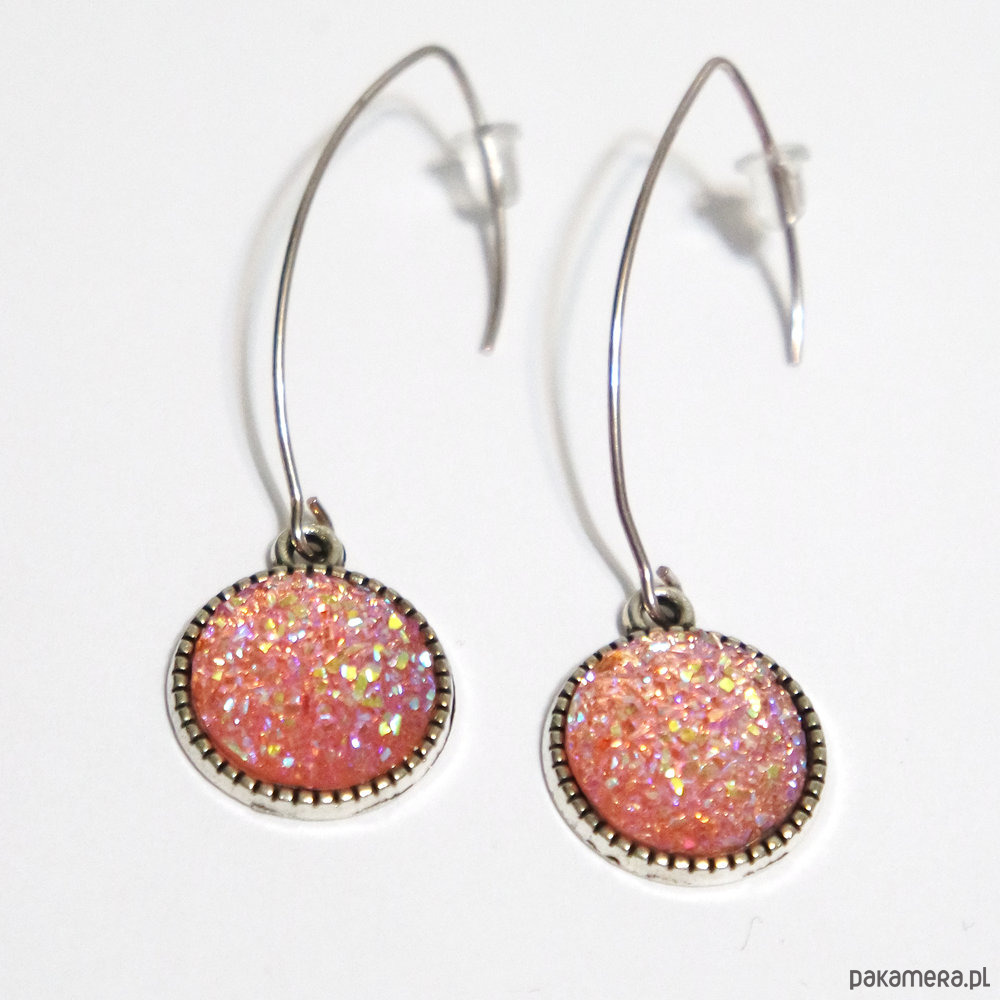 Unikatowe kolczyki z oczkiem z żywicy - druzy, mieniące się w odcieniach jasnego różu.