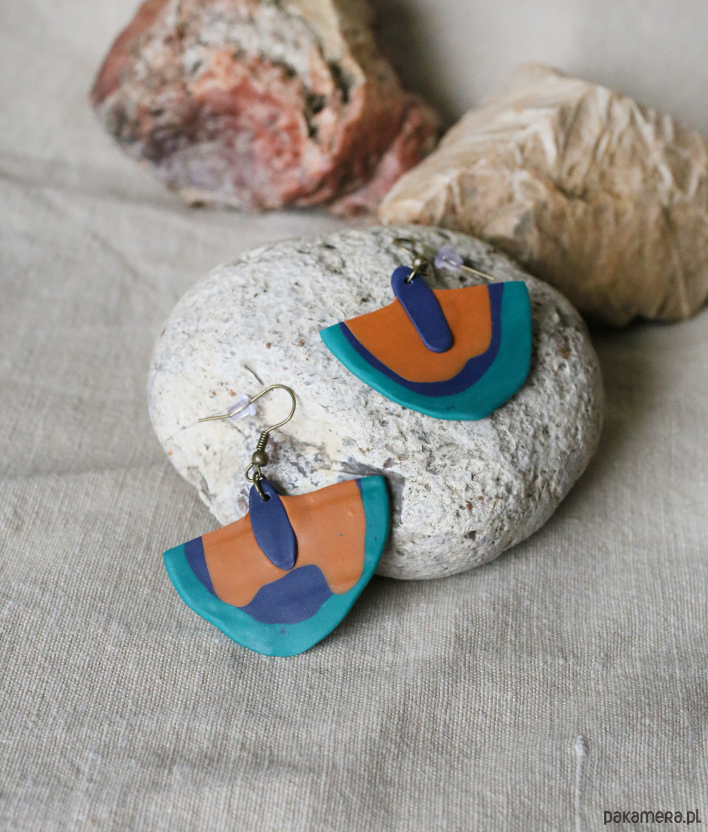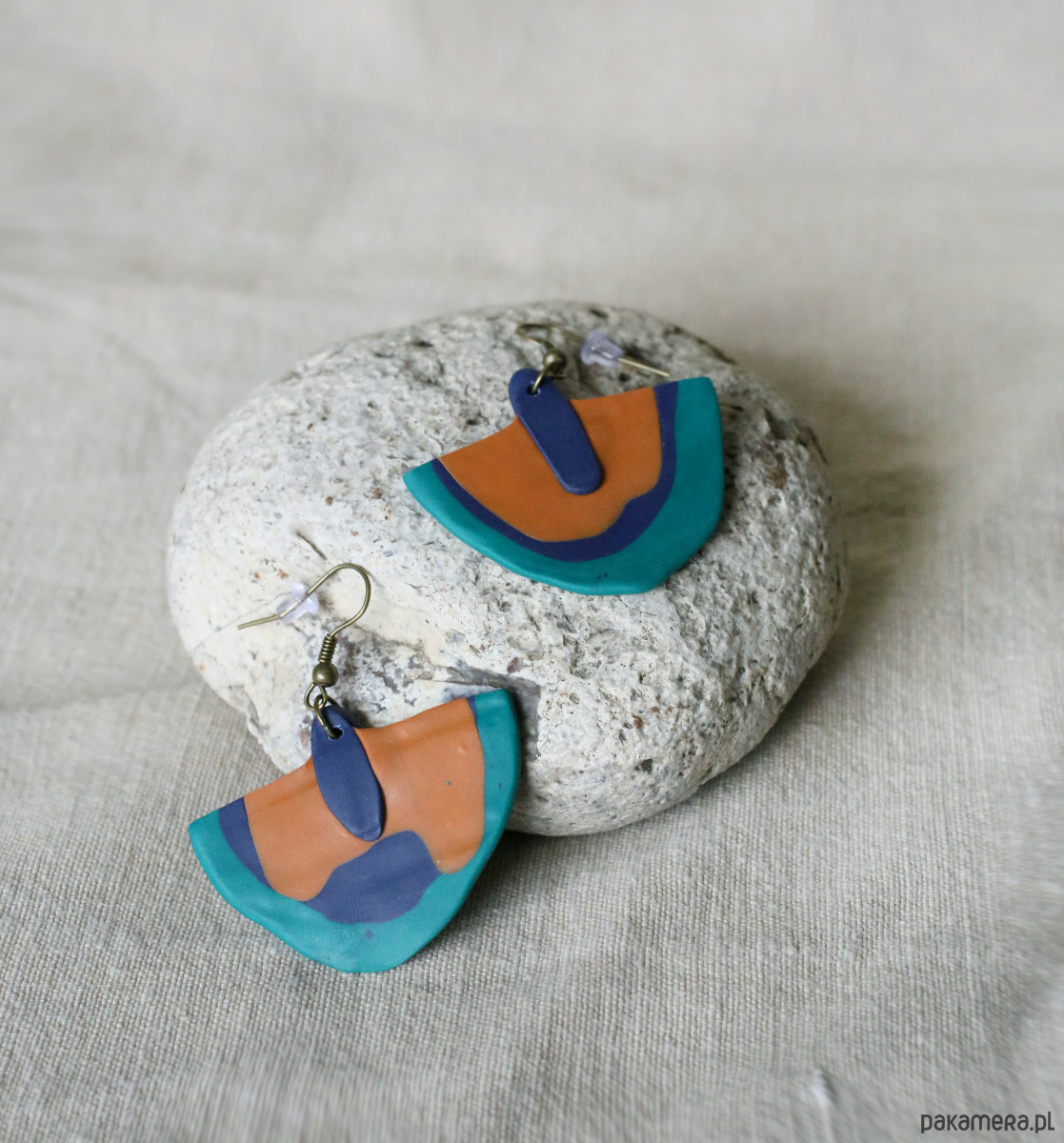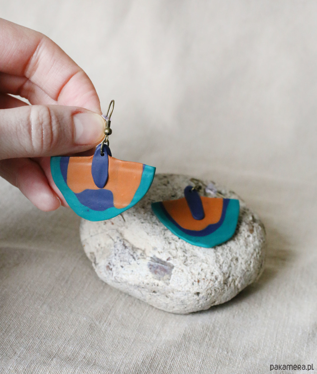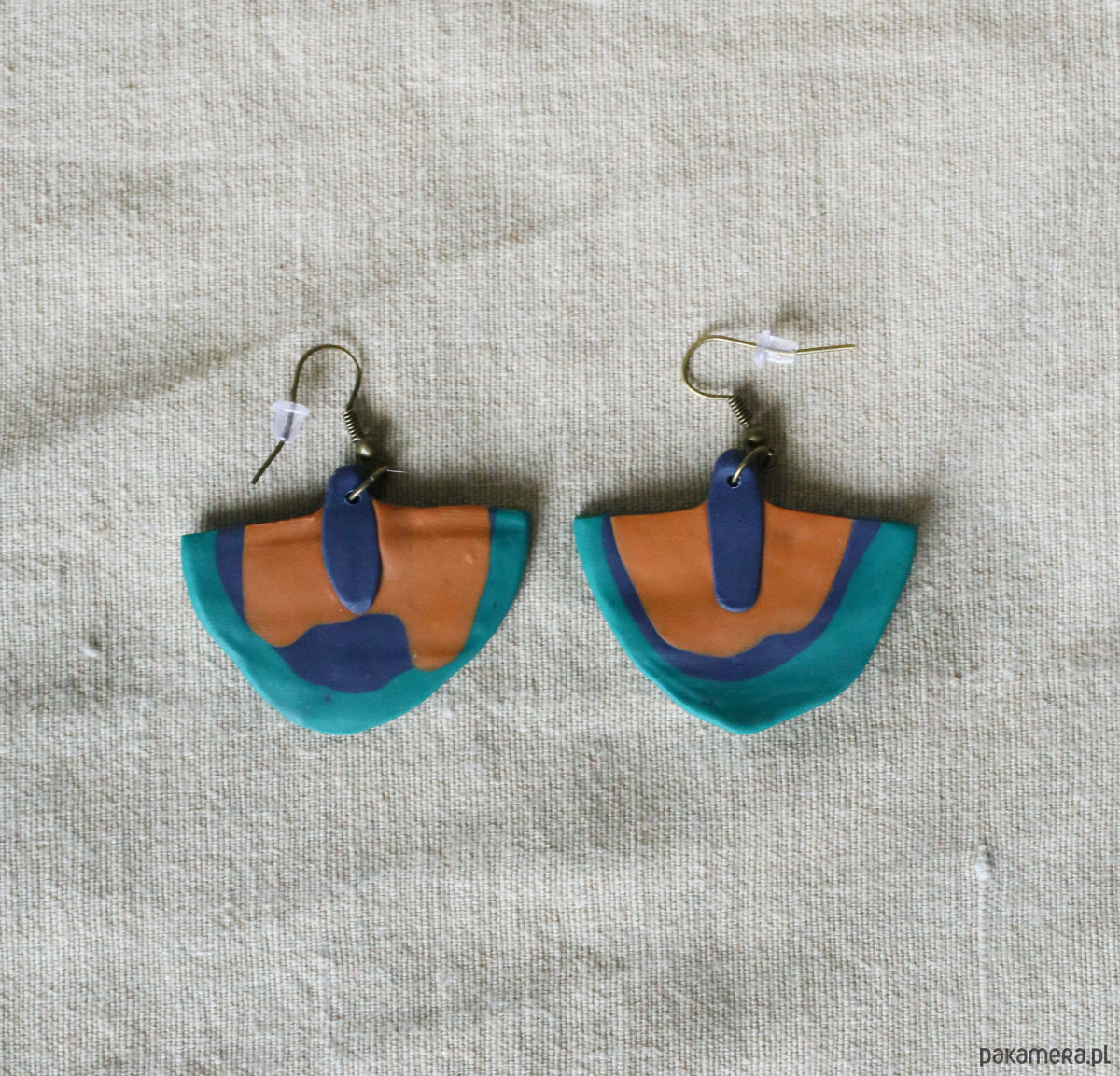Kolczyki wiszące, wykonane z modeliny fimo, w różnobarwnych zestawieniach. Bigle ze stali w kolorze brązu.