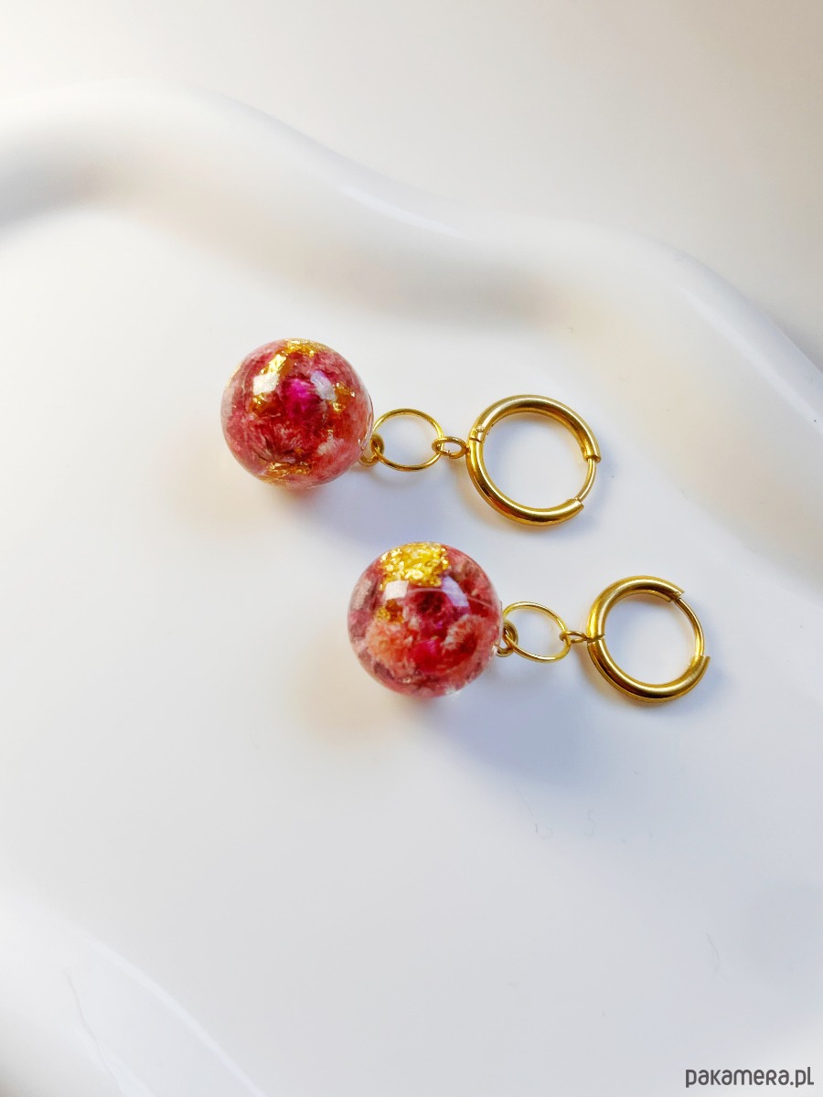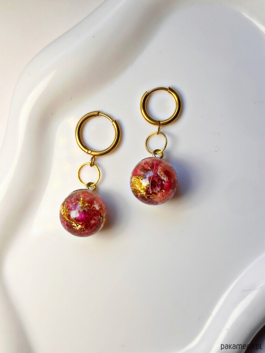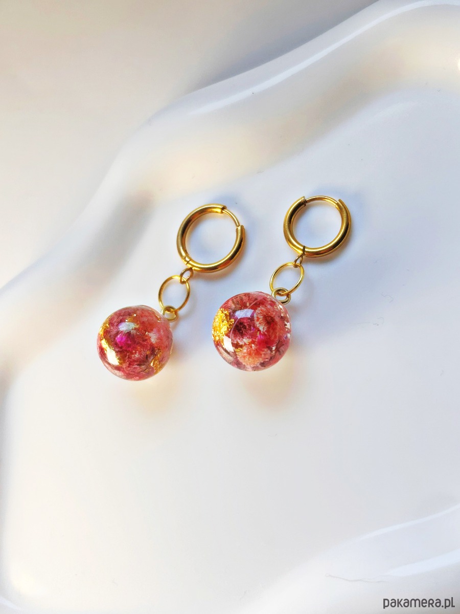 Kolczyki w formie lekkich, połyskujących kul, w których zatopiłam delikatne kwiaty gipsówki. Każda para jest wyjątkowa — naturalne płatki układają się inaczej, tworząc subtelny, romantyczny wzór. Kule pięknie odbijają światło, a złote akcenty dodają im elegancji i biżuteryjnego blasku.