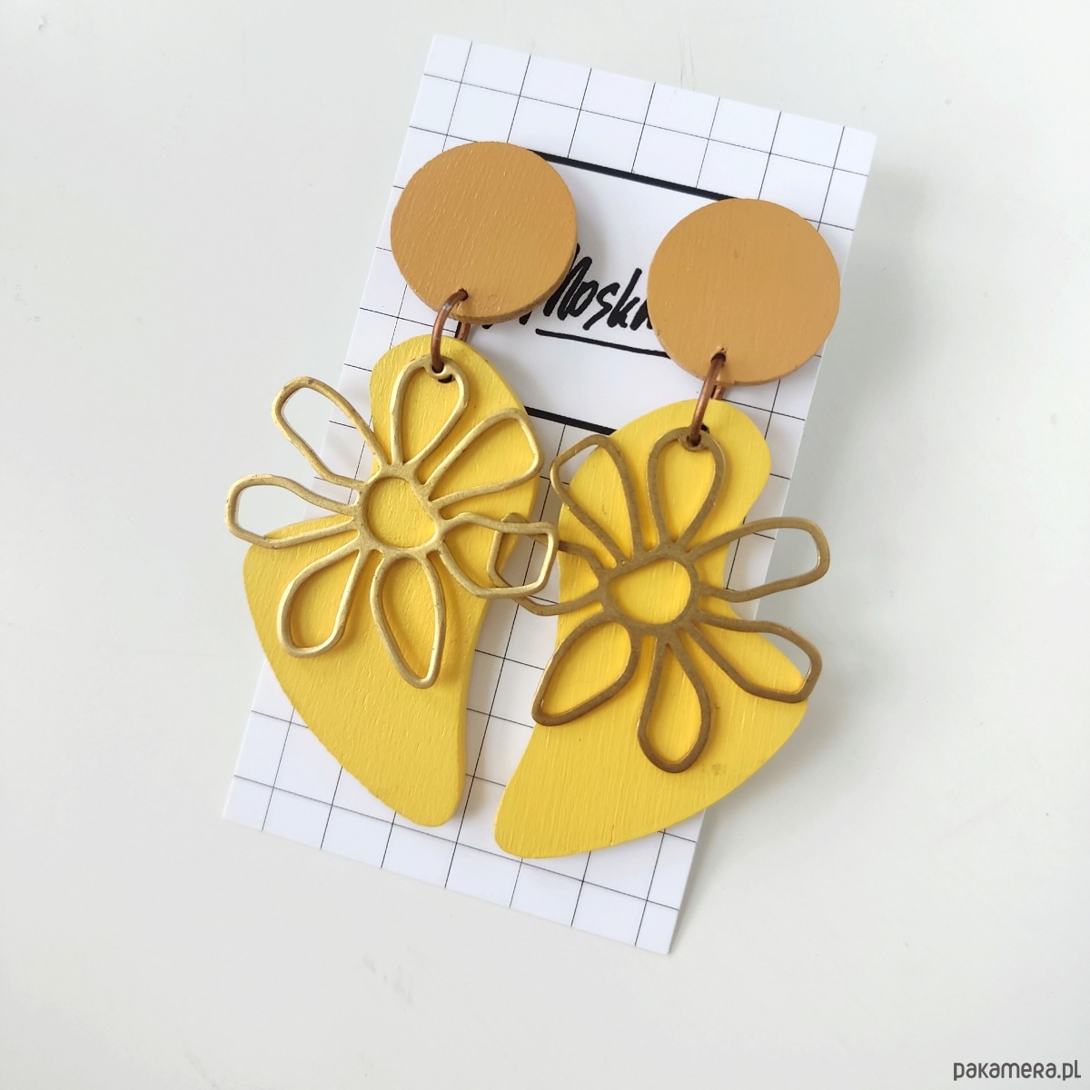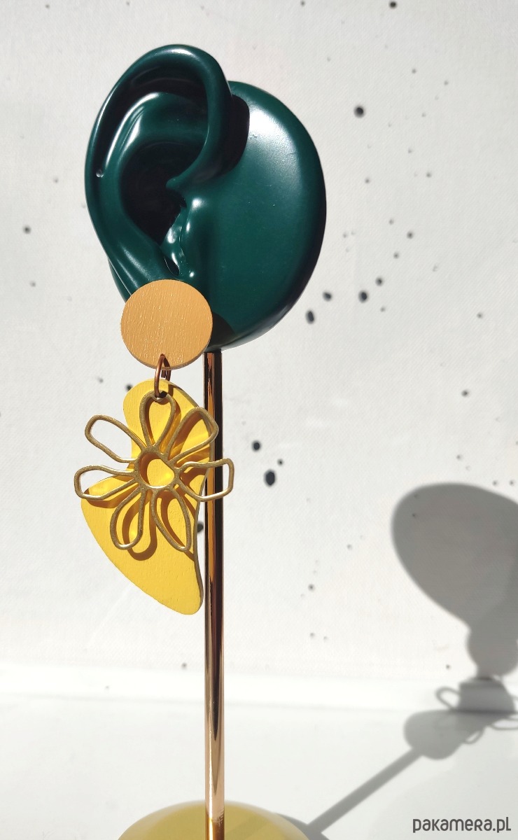 Wielkie drewniane kolczyki - elipsy, wykonane ze sklejki i mosiądzu i malowane ręcznie. Lekkie; nie obciążają ucha.