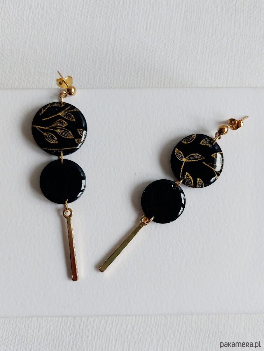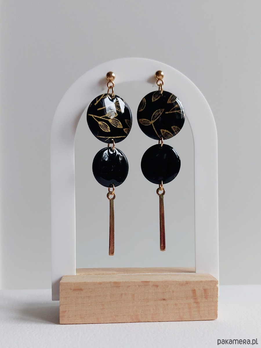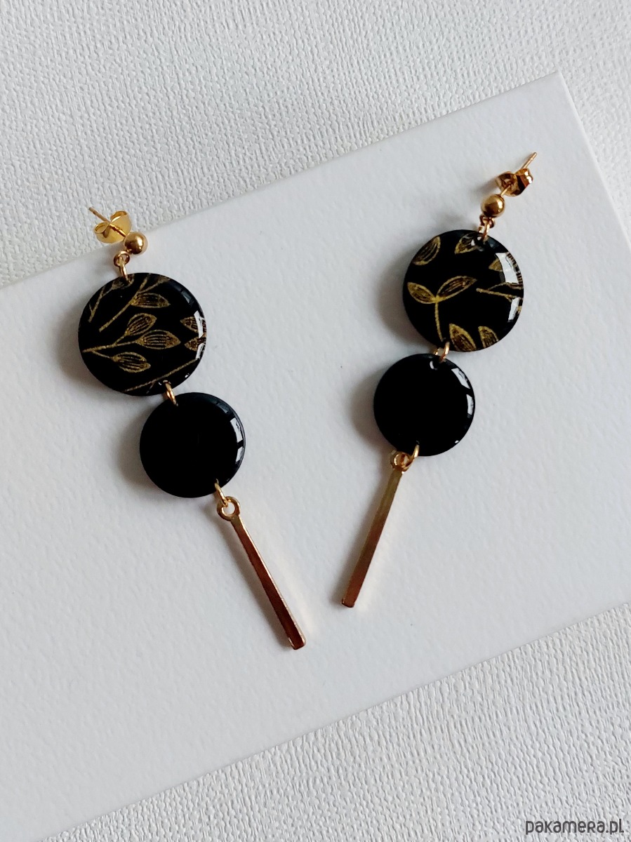 Geometryczna forma zestawiona z długą, prostą zawieszką w kolorze złota tworzy biżuterię, która doskonale dopełnia zarówno wieczorowe, jak i codzienne stylizacje. Połączenie czerni z połyskującymi, złotymi akcentami sprawia, że kolczyki są eleganckie, nowoczesne i pełne charakteru.
