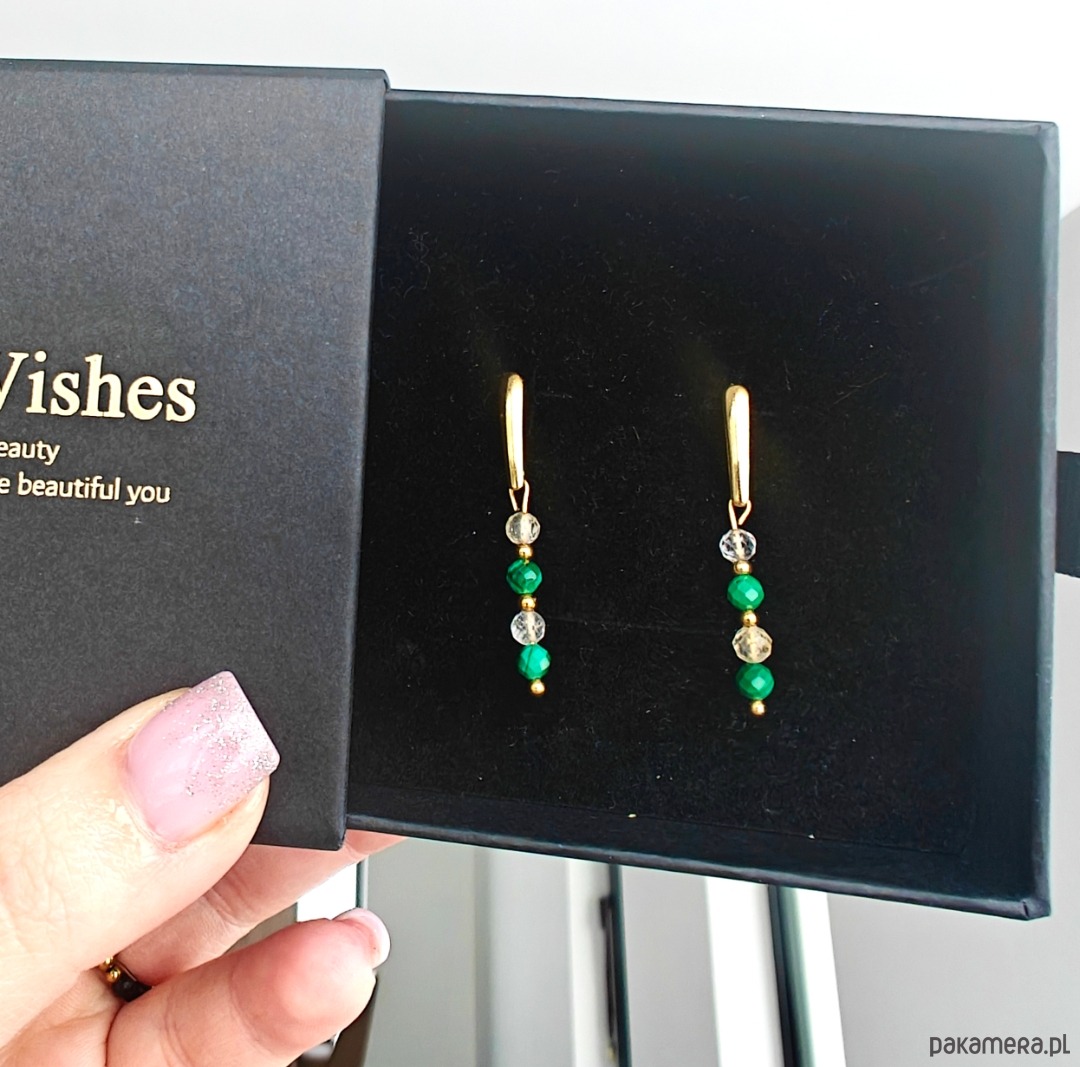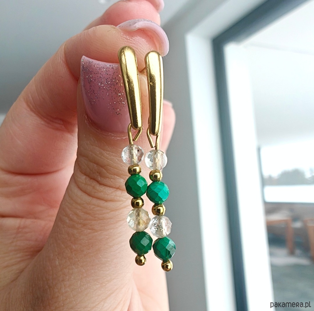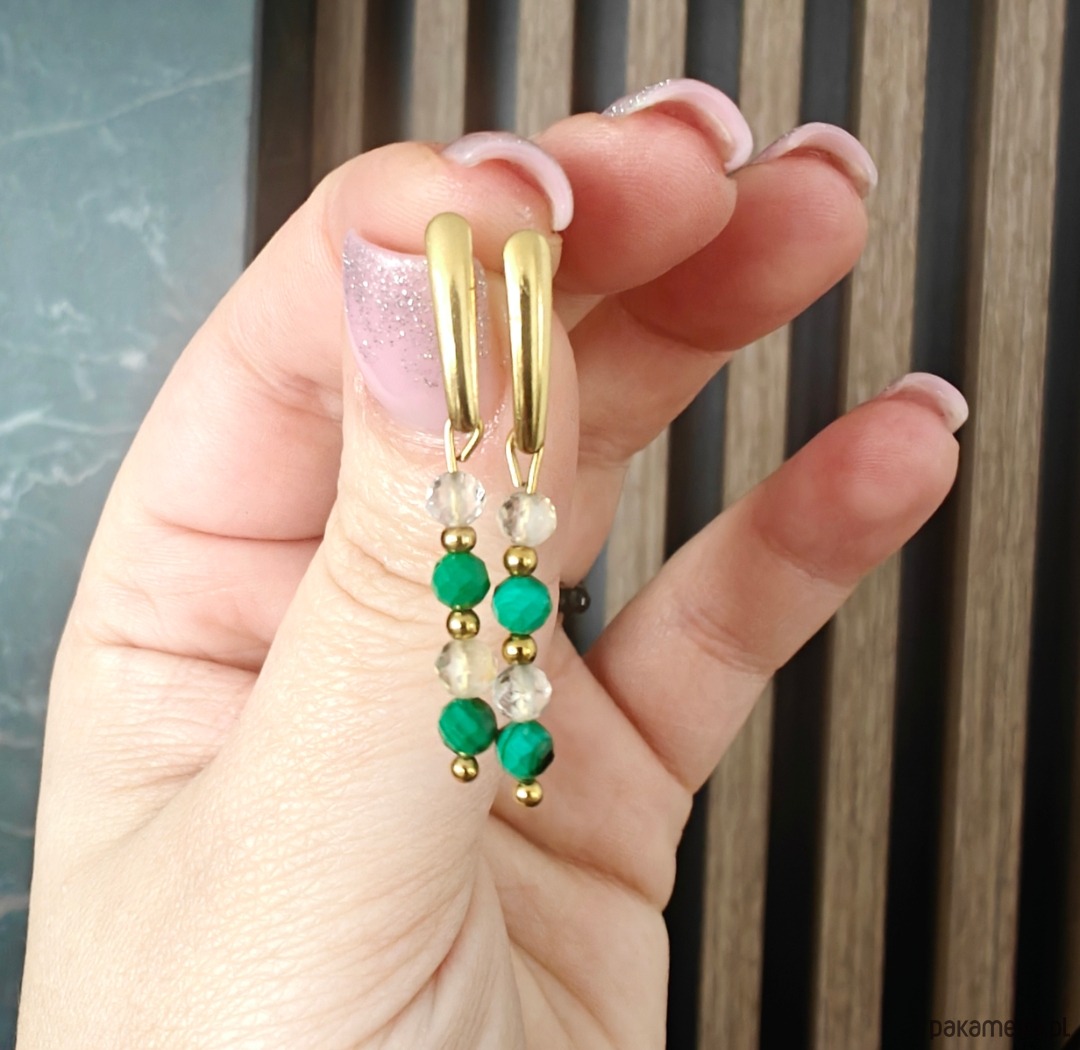 Kolczyki wiszące o długości około 4 cm, zapinane na wygodny sztyft. Wykonane z naturalnych kamieni: malachitu oraz cytrynu. Subtelne, a jednocześnie wyraziste, pięknie dopełniają zarówno codzienne, jak i bardziej eleganckie stylizacje.