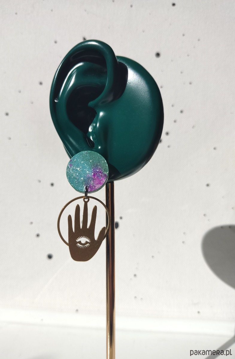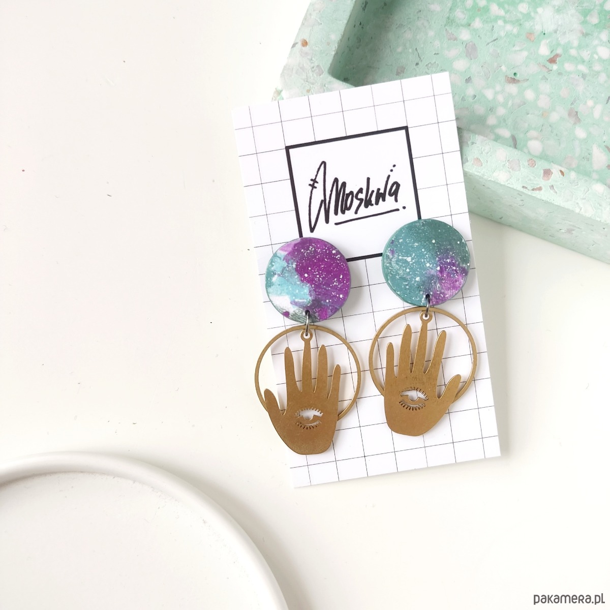 Długie drewniane kolczyki, malowane ręcznie , dekorowane decoupage, z mosiężną zawieszką. Lekkie; nie obciążają ucha.