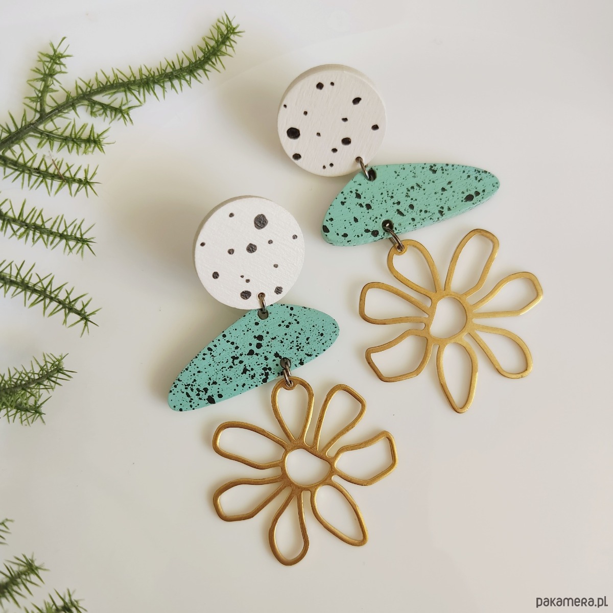 Duże drewniane kolczyki, wykonane ze sklejki i malowane ręcznie. Kwiat - mosiądz. Lekkie; nie obciążają ucha.