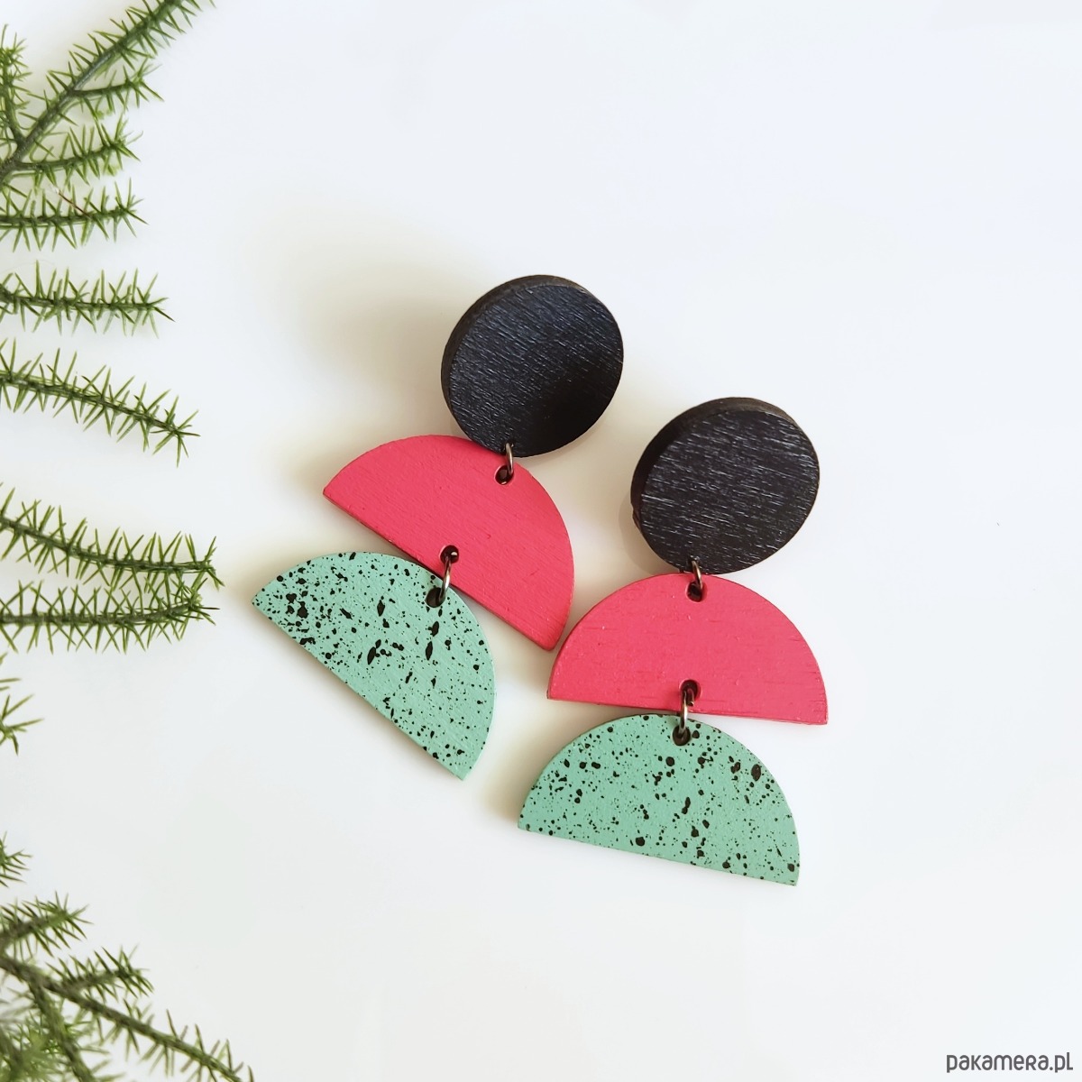 Duże drewniane kolczyki, wykonane ze sklejki i malowane ręcznie. Lekkie; nie obciążają ucha.