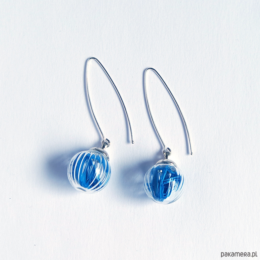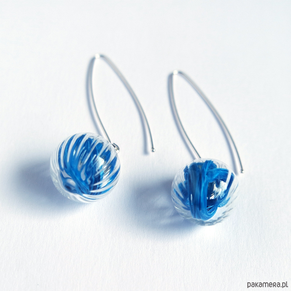 Niebieskie piórko umieszczone w delikatnie fasetowanych, szklanych bańkach o średnicy ok. 1,2 cm.